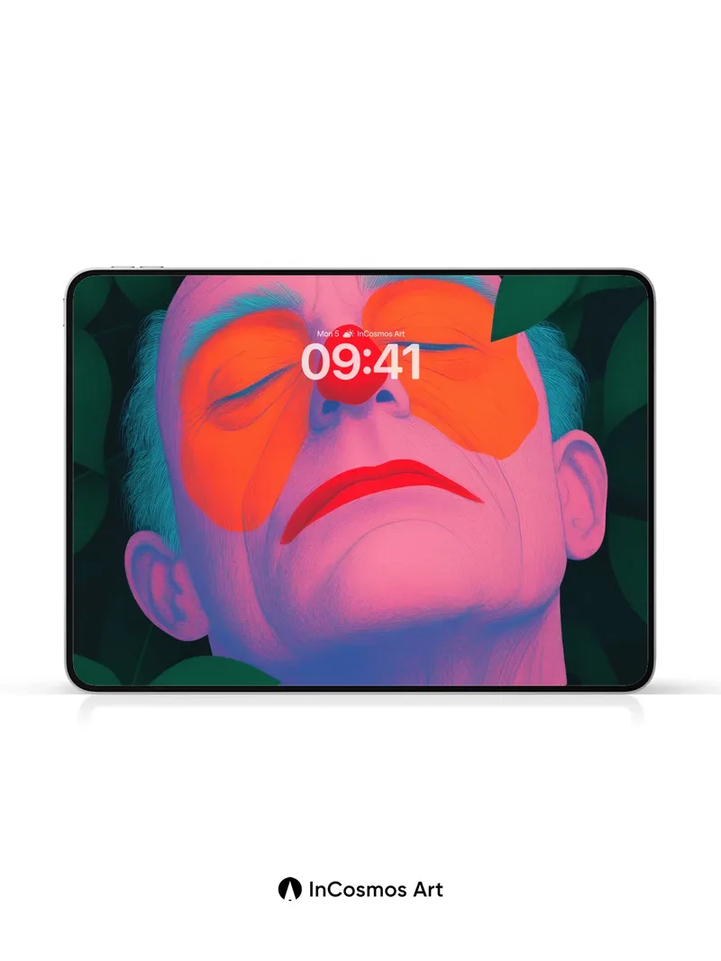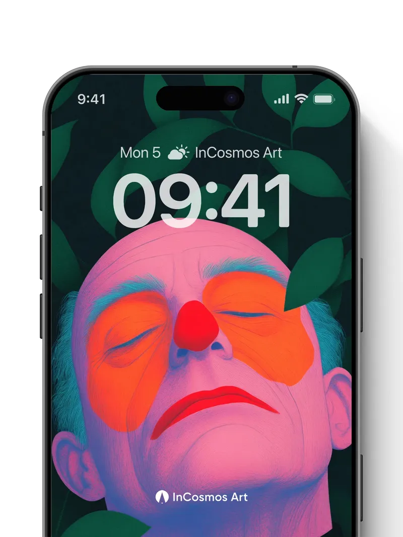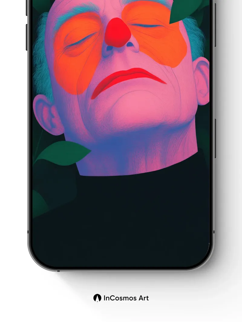 Debug product.metafields.custom.desc: Did you know that the human face can hold entire galaxies of emotion in silence? Here, a painted visage rests beneath emerald leaves, its skin bathed in neon magenta and cyan, eyes closed like petals under twilight. The red nose—sharp, absurd—contrasts the tranquil serenity, as if laughter were once buried deep within this stillness. Light crawls over creases like liquid memory, each fold whispering stories of performance and solitude.