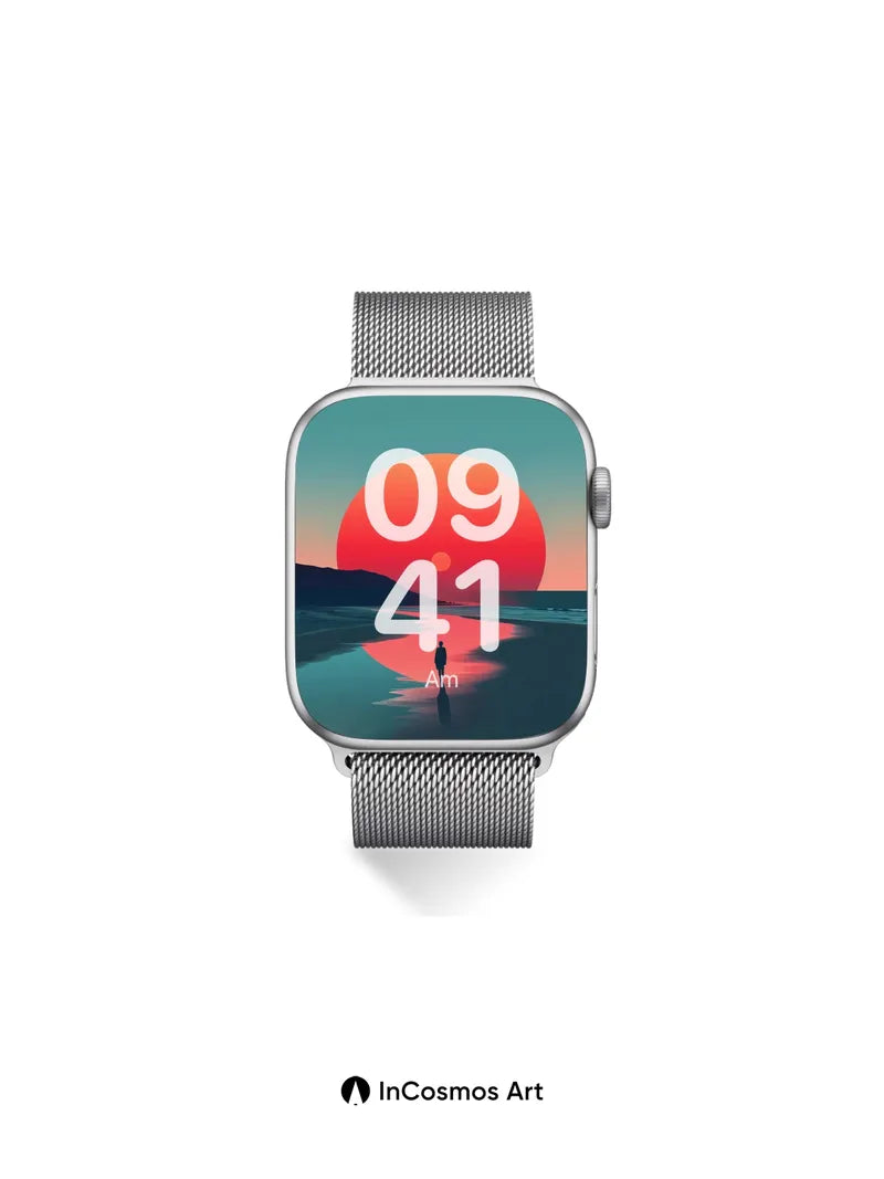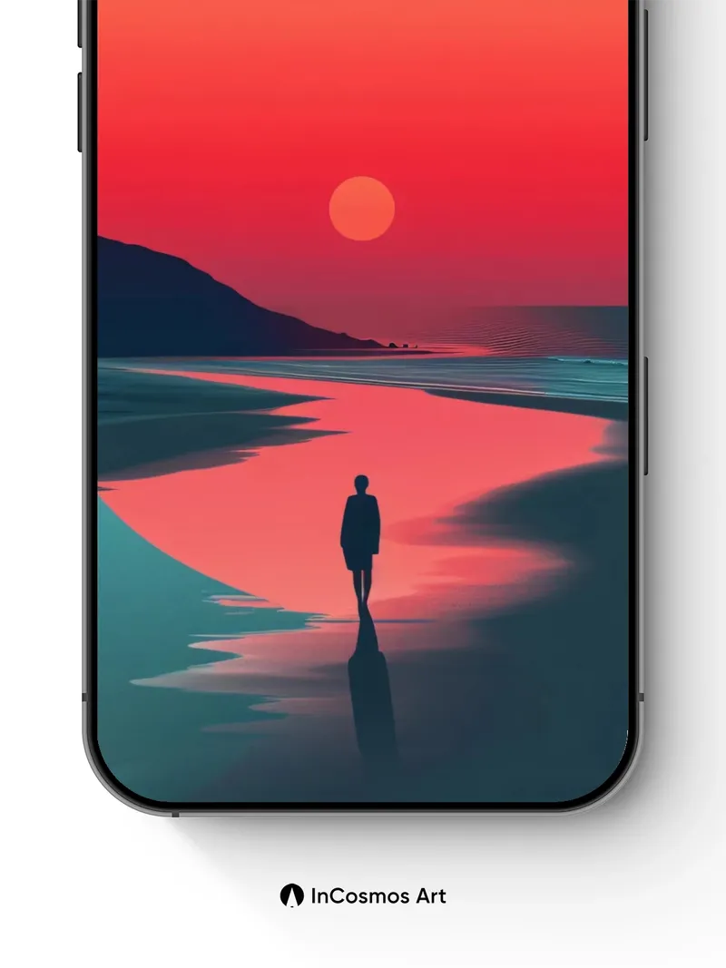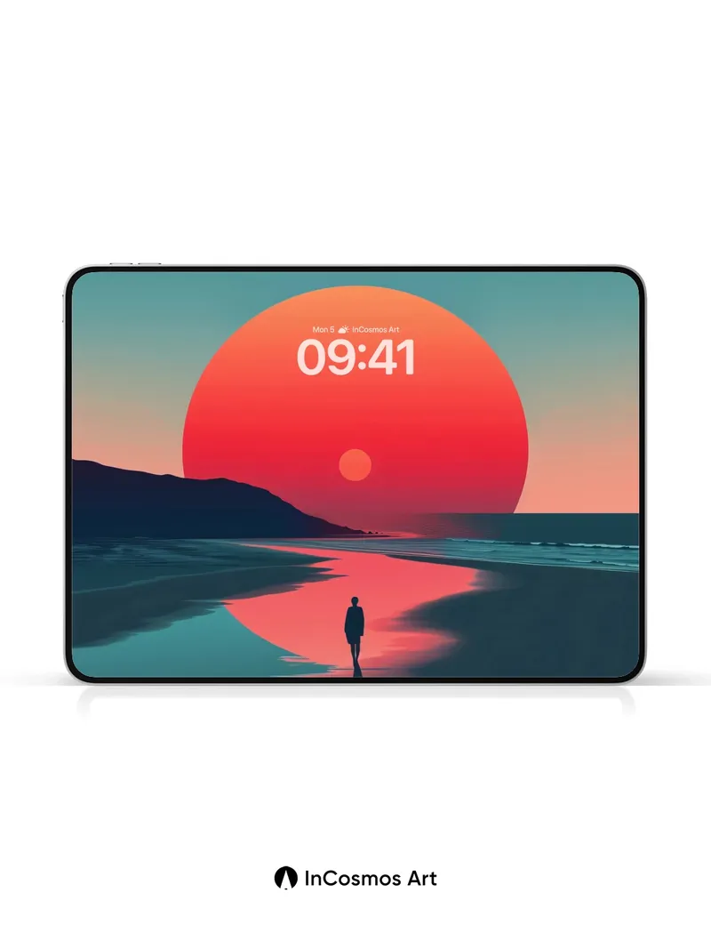 Debug product.metafields.custom.desc: Did you know the color of a sunset can shift based on atmospheric particles, creating hues that seem to breathe across the sky? Here, a colossal sun hovers like a molten orb over a still beach, its reflection crawling through wet sand as if time itself has slowed. A lone figure walks toward it, silhouette stretched long by the dying light—each step echoing in silence.
