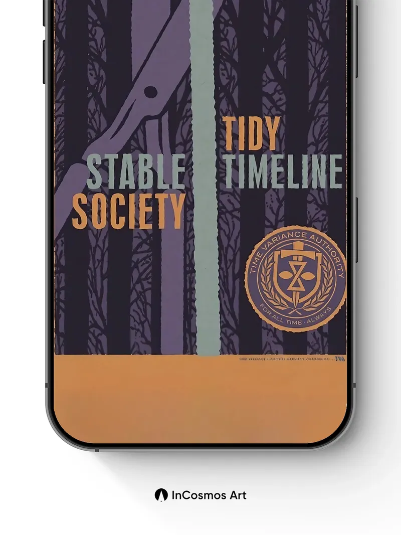 Did you know the Time Variance Authority’s emblem was inspired by ancient clockwork seals? A pair of oversized scissors slices through a shadowy forest, their blades gleaming like obsidian under a muted twilight. The trees bleed into silhouettes, their branches entwined like forgotten timelines, while a single vertical strip of pale green divides reality—calm on one side, chaos on the other. You feel the weight of order pressing down, yet beneath it, a quiet rebellion hums in the roots.