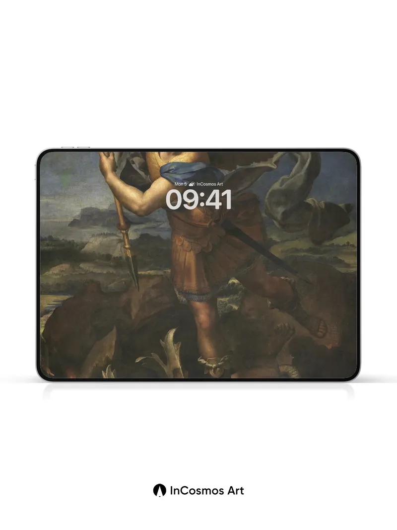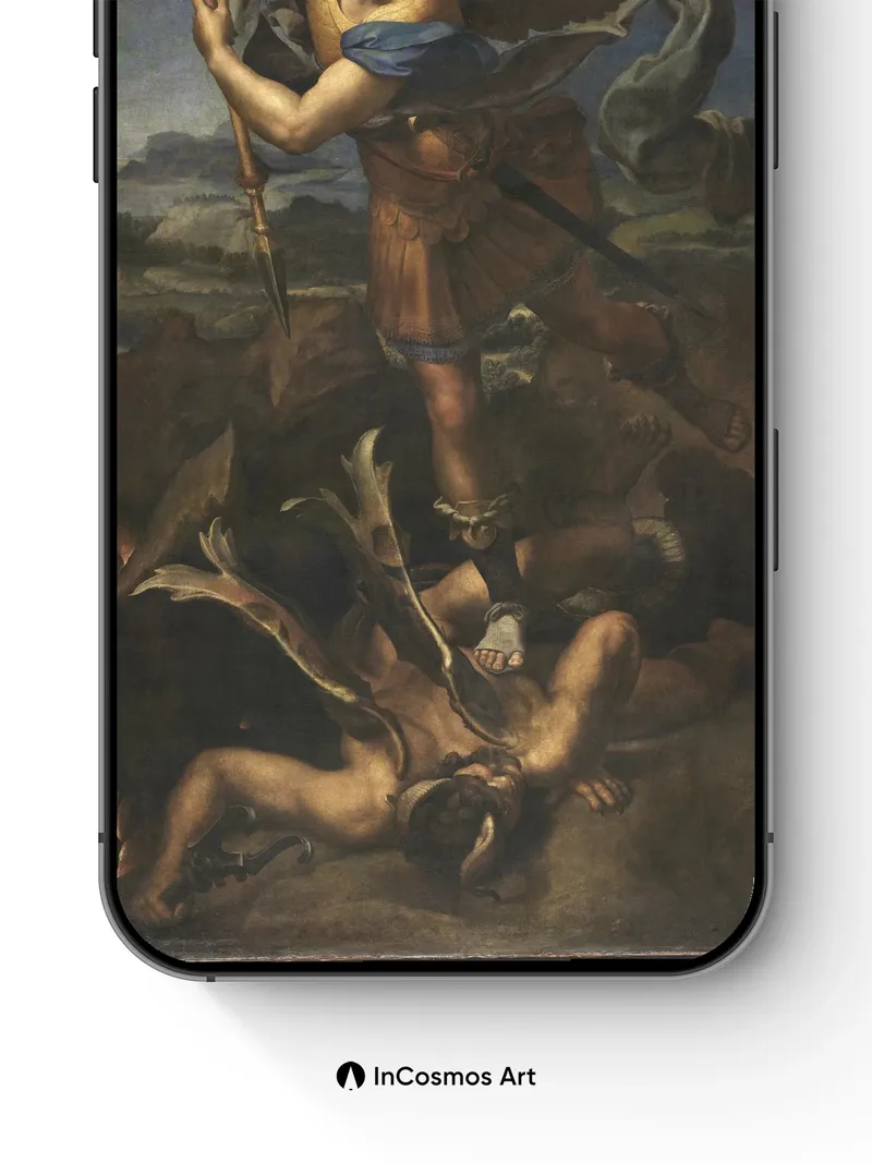 Did you know the wings in Renaissance paintings were often painted with layers of gold leaf to catch light like feathers? Here, they shimmer as if breathing fire above a battlefield of stone and shadow. The angel’s gaze is calm, yet her spear pierces not just flesh but time itself—her armor worn from ancient battles, her robes fluttering as though caught in a wind that only gods can feel.