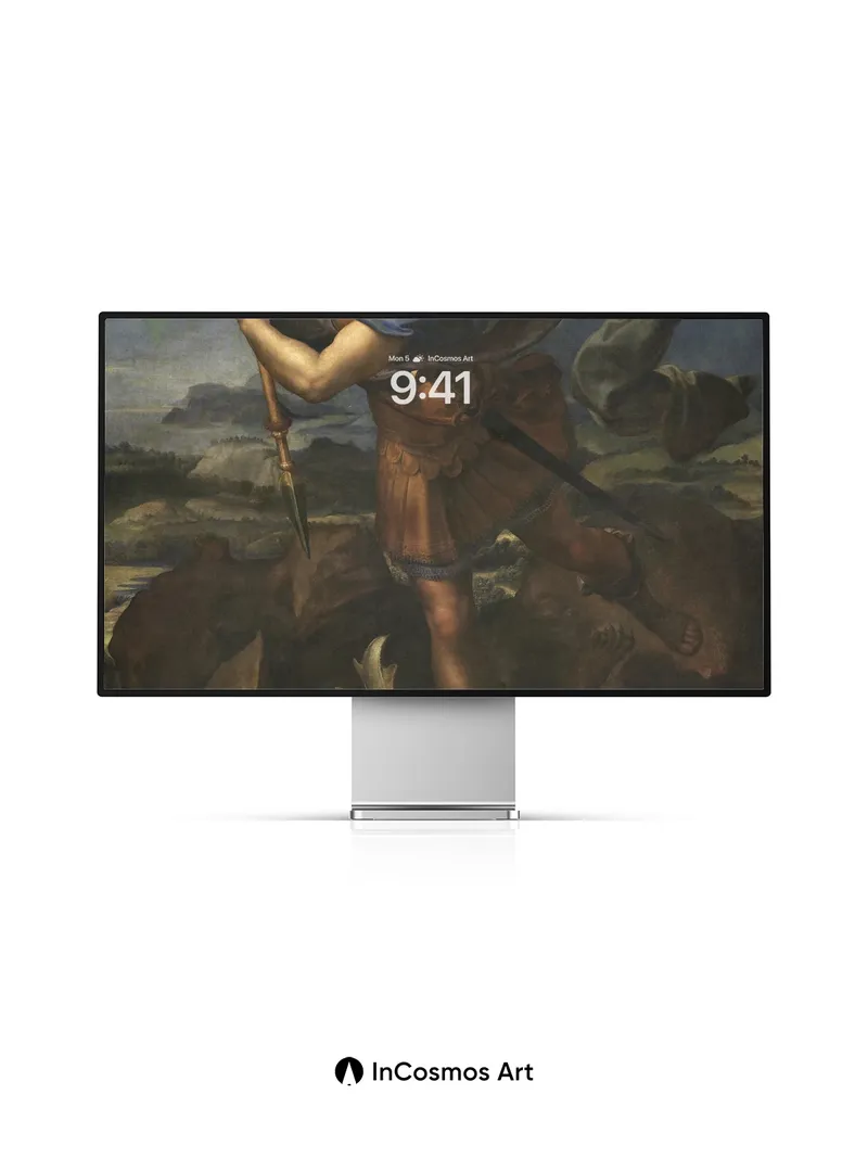 Debug product.metafields.custom.desc: Did you know the wings in Renaissance paintings were often painted with layers of gold leaf to catch light like feathers? Here, they shimmer as if breathing fire above a battlefield of stone and shadow. The angel’s gaze is calm, yet her spear pierces not just flesh but time itself—her armor worn from ancient battles, her robes fluttering as though caught in a wind that only gods can feel.