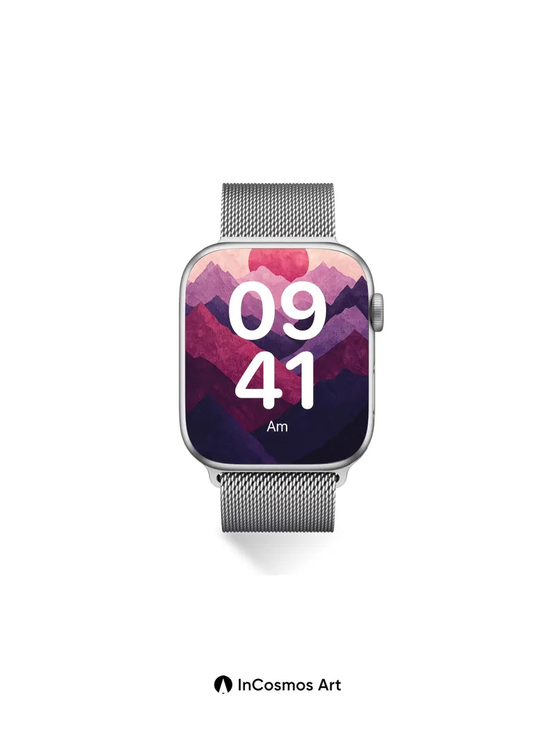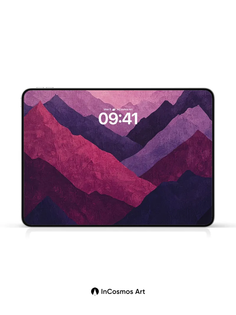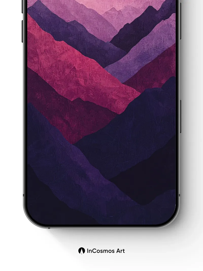 Debug product.metafields.custom.desc: Did you know that ancient cultures believed mountains were the spines of sleeping gods? Here, jagged peaks rise like folded silk, each ridge breathing in deep magenta and indigo hues, while a molten crimson sun hovers above, casting long shadows that crawl across the terrain like whispers. The texture feels like aged parchment kissed by twilight, where light doesn’t shine—it settles into the crevices like memory.