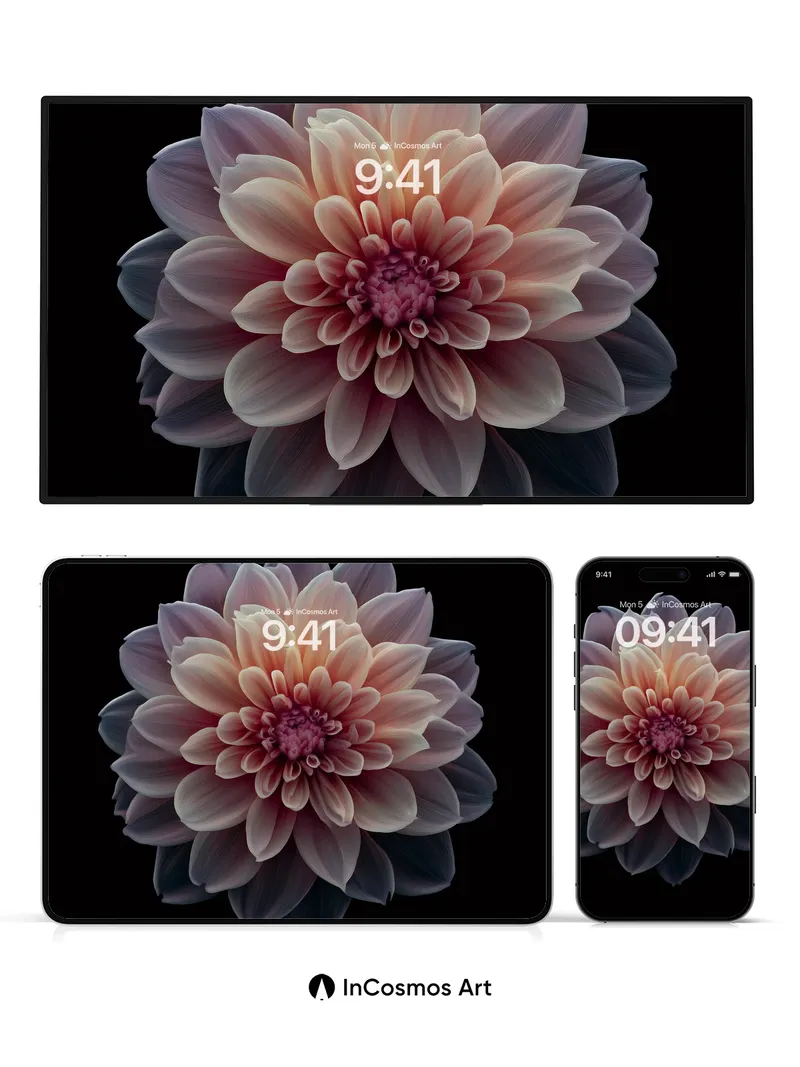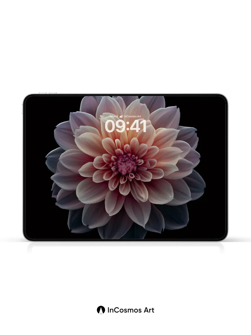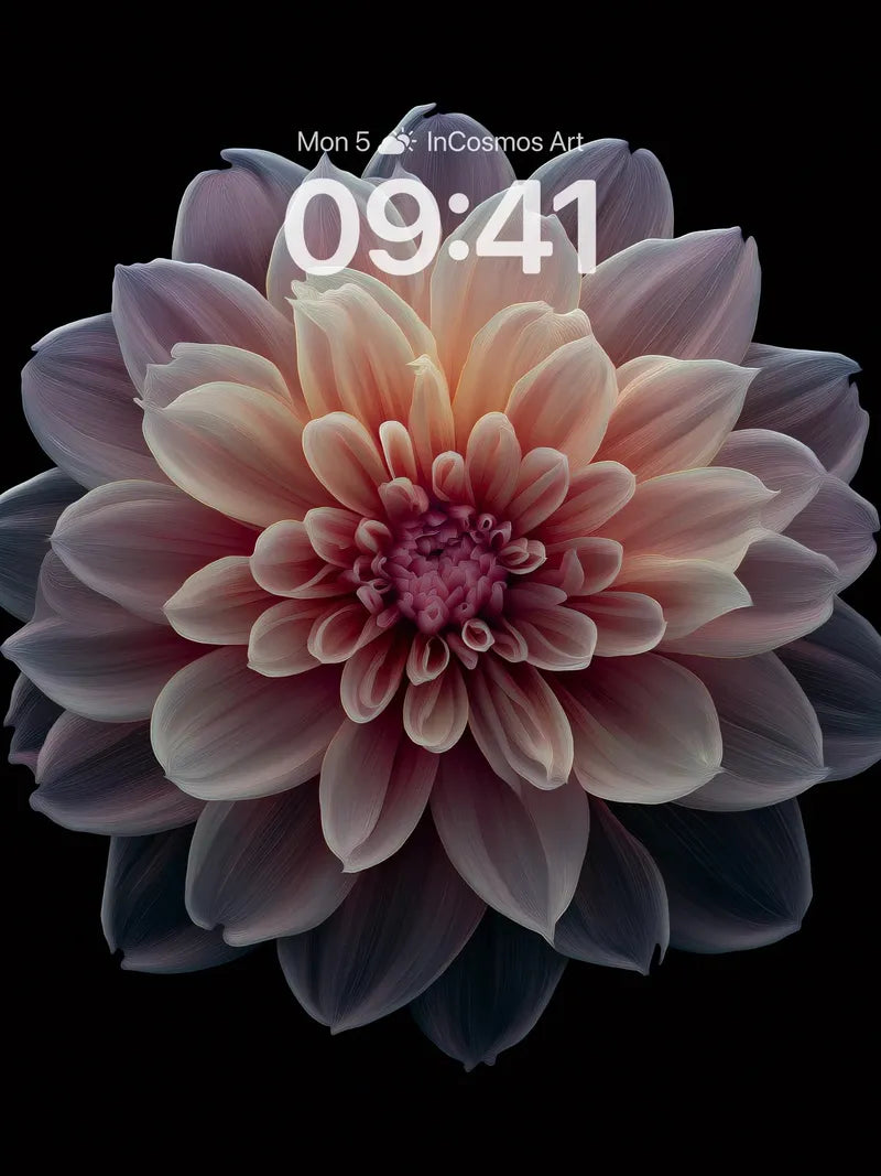 Debug page_description: Did you know that dahlia petals can hold moisture like tiny reservoirs, catching light in ways that mimic starlight? This bloom unfolds in soft gradients, each petal a whisper of peach and lavender, edged in shadow like silk kissed by dusk. The center pulses with quiet intensity, a heart of rose-hued mystery that draws your gaze inward, as if the flower breathes slowly, alive in stillness. Share this with your best friend. Send this to your love and swap a matching set. What if every night, your walls opened into a secret garden?