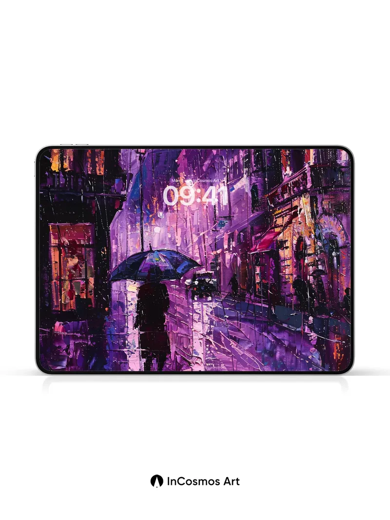 Debug page_description: Did you know that in the 19th century, Parisian cobblestones were polished with horsehair and beeswax to catch moonlight like liquid glass? Here, purple rain crawls across wet stone, each droplet a tiny prism refracting electric hues from gaslit windows and flickering signs. A solitary figure under an umbrella walks into the glow, their silhouette dissolving into the street’s mirror-slick surface—where light doesn’t just fall, it breathes. Share this with your best friend. Send this to your love and swap a matching set. What if every puddle held a different memory?
