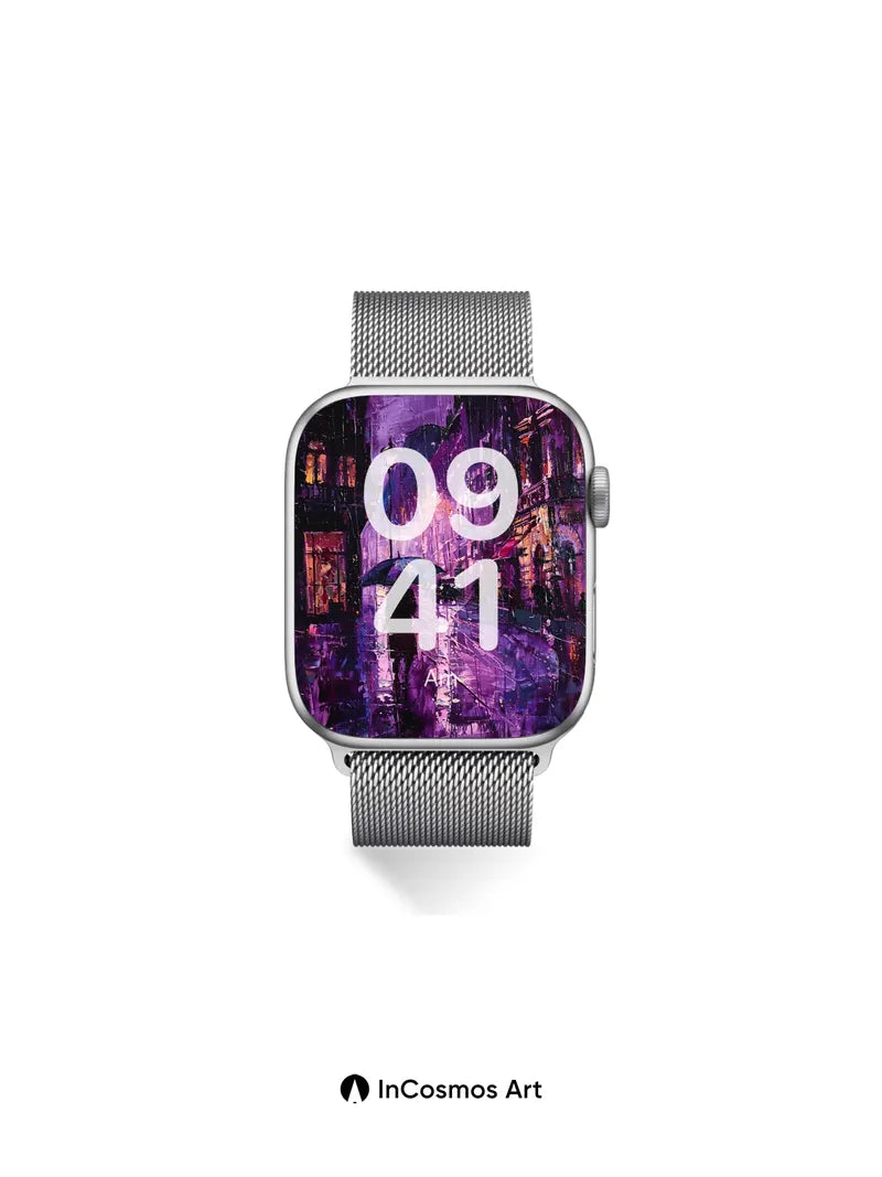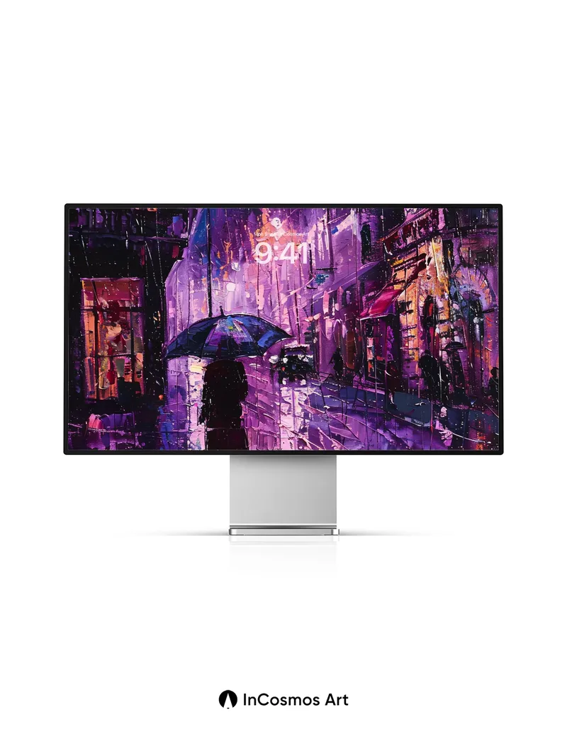 Debug product.metafields.custom.desc: Did you know that in the 19th century, Parisian cobblestones were polished with horsehair and beeswax to catch moonlight like liquid glass? Here, purple rain crawls across wet stone, each droplet a tiny prism refracting electric hues from gaslit windows and flickering signs. A solitary figure under an umbrella walks into the glow, their silhouette dissolving into the street’s mirror-slick surface—where light doesn’t just fall, it breathes.