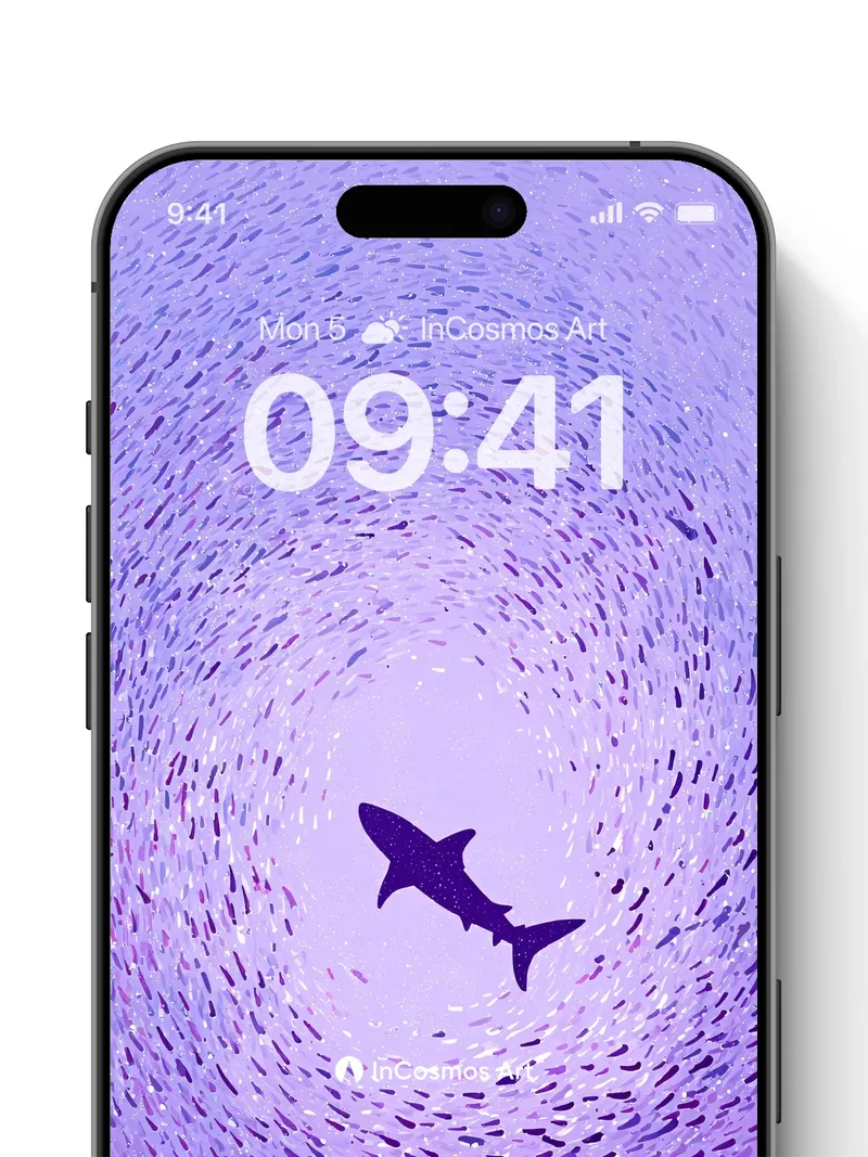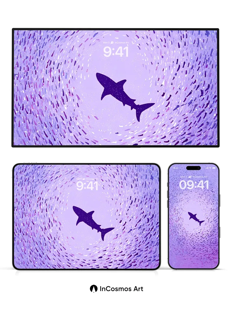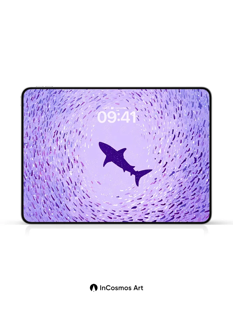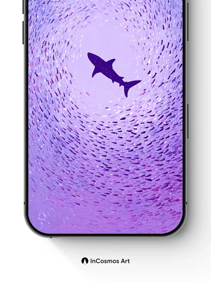 Debug page_description: A deep violet haze surrounds a single shark, its form cut from the light like a shadow on silk. Did you know that sharks have been swimming the oceans for over 400 million years, long before the dinosaurs? Their presence here feels ancient, a quiet pulse in a swirling, star-dusted sea. A deep violet haze surrounds a single shark, its form cut from the light like a shadow on silk. Did you know that sharks have been swimming the oceans for over 400 million years, long before the dinosaurs? Their presence here feels ancient, a quiet pulse in a swirling, star-dusted sea. Share this with your best friend. Send this to your love and swap a matching set. What secrets do you keep in your own deep waters?
