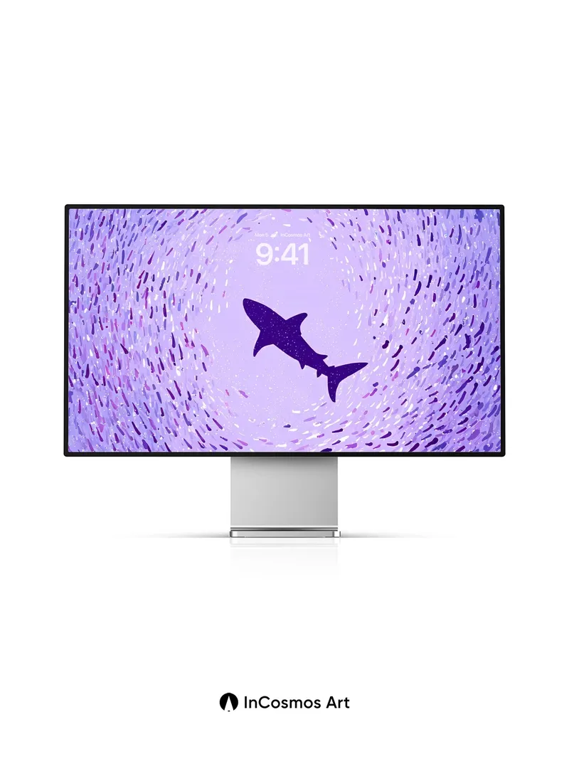 Debug product.metafields.custom.desc: A deep violet haze surrounds a single shark, its form cut from the light like a shadow on silk.