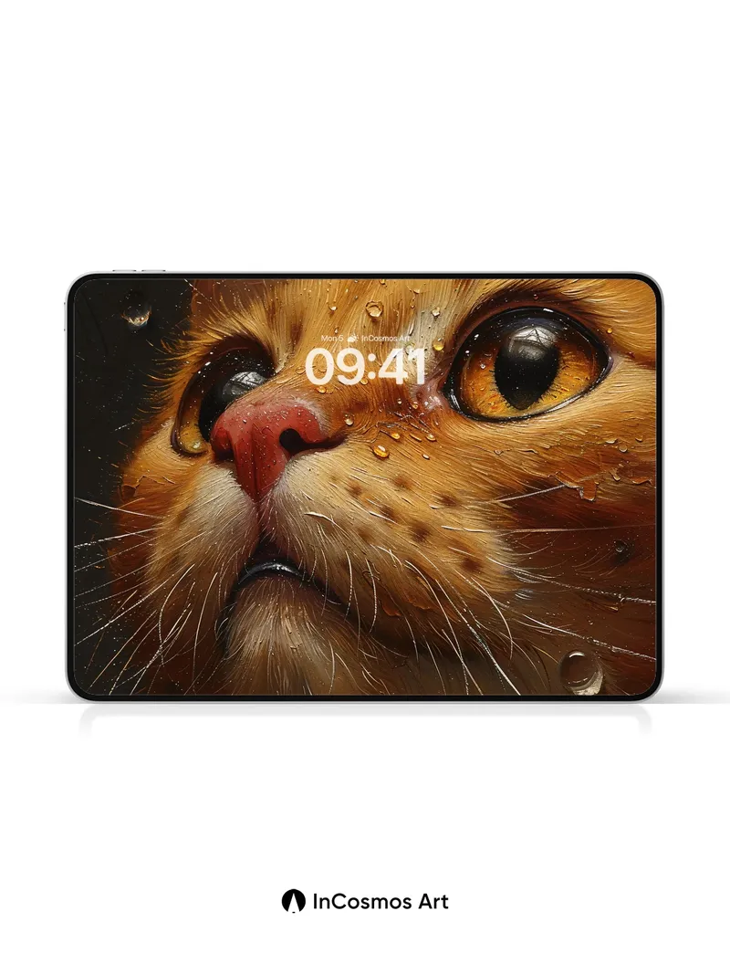 Debug product.metafields.custom.desc: Did you know cats can see in near-complete darkness, their pupils dilating to capture every whisper of light? This close-up captures raindrops clinging to golden fur like tiny prisms, each bead refracting the world into miniature galaxies. The eyes—wide, alert, and liquid gold—hold a quiet intensity that feels almost human, as if they’re reading your soul before you’ve spoken a word.