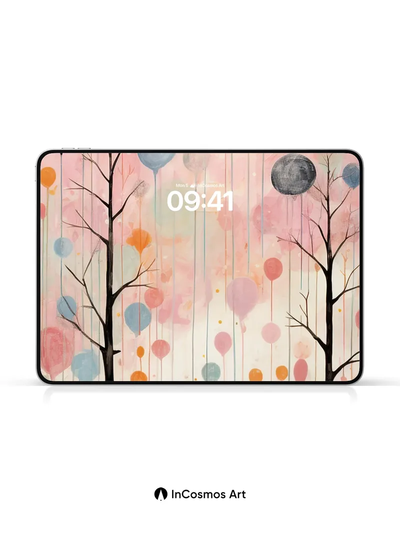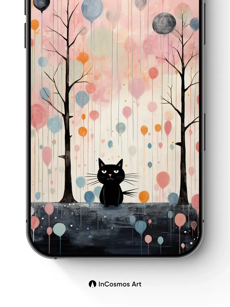 Whimsical Balloon Rain Wallpaper with Midnight Cat