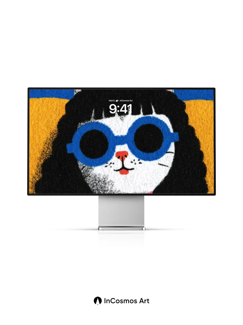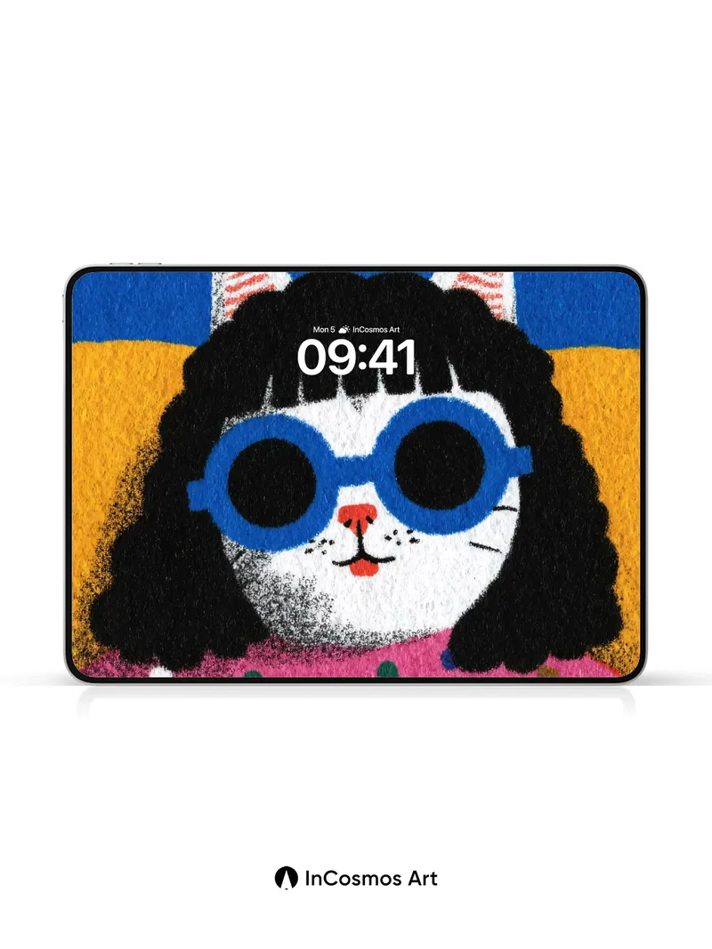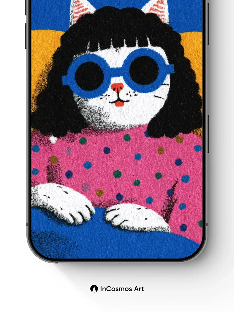 Debug product.metafields.custom.desc: Did you know that the texture of this artwork mimics hand-stitched fabric, where each thread holds a story? A cat with bold blue spectacles and a polka-dotted pink sweater sits against a deep cobalt backdrop, its fur like ink-dipped wool, eyes hidden behind round lenses that reflect a quiet world of curiosity. The yellow cushion beneath feels warm under imagined fingers, while the patterned dress hums with playful rhythm.