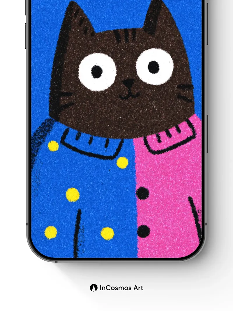 Did you know that cats have been painted in art for over 5,000 years, from ancient Egypt to modern illustration? This bold feline wears a split coat of electric blue and vivid magenta, each side stitched with contrasting buttons—yellow like sunbeams, black like nightfall—against a deep cobalt backdrop that hums with quiet energy. The texture feels like brushed wool under fingertips, the eyes wide with gentle curiosity as if peering into your soul.