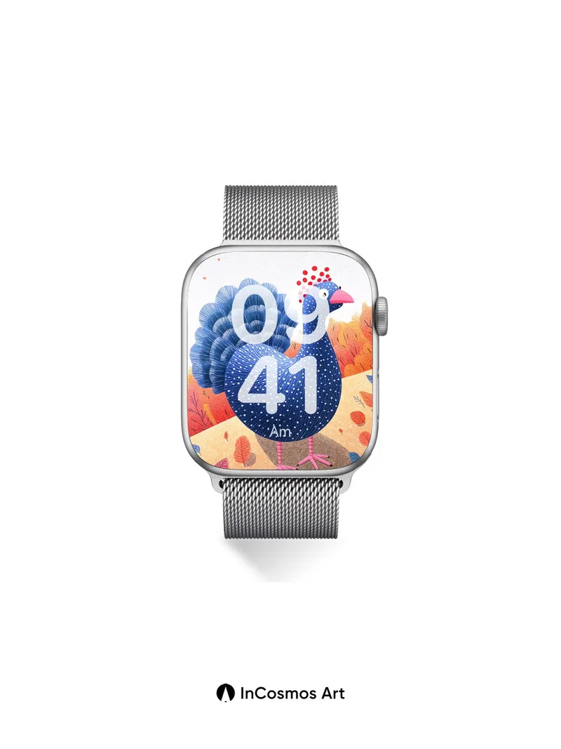 Debug product.metafields.custom.desc: Did you know turkeys have a third eyelid that sweeps across their eye like a silent curtain? This deep navy bird, dotted with tiny stars and crowned in crimson beads, stands proudly on a golden path where autumn leaves flutter like forgotten poems. Its feathers fan out like a celestial peacock, each one etched with fine lines that catch the light as if breathing in rhythm with the season.