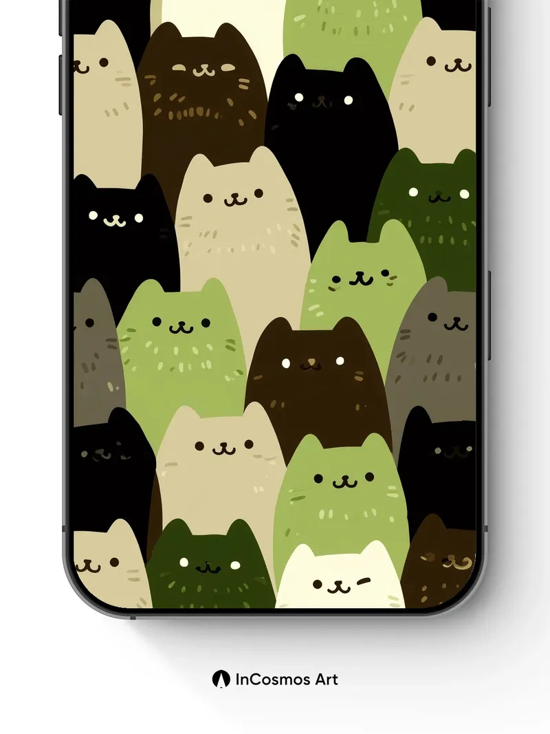 Did you know cats have been domesticated for over 9,000 years, yet their quiet gaze still holds ancient mystery? This pattern breathes life into a sea of stylized felines, each one a soft silhouette with gentle whiskers and tiny noses, stacked like a living mosaic. The muted greens, creams, and deep blacks ripple across the canvas like a forest of purring shadows, where every cat is both individual and part of a greater calm.