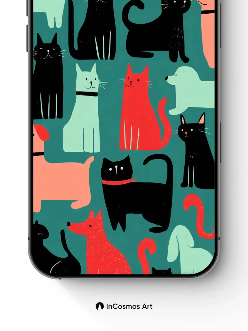 Debug og_description: Did you know cats have been depicted in art for over 4,000 years, often as guardians of sacred spaces? Here, they float like silhouettes across a teal canvas, their forms stitched in bold reds, soft mint, and midnight black—each one a quiet rebel in a world of endless curiosity. Their eyes hold secrets, tails curl like question marks, and every glance feels like a secret shared between you and the wall.