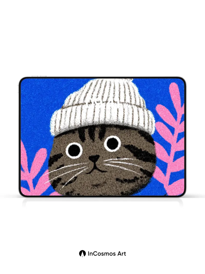 Debug page_description: Did you know that cats have been wearing hats in art since the 17th century, often symbolizing mystery and wit? This feline face, wrapped in a soft knit cap, peeks through coral-hued leaves against a deep cobalt sky—its wide eyes reflecting quiet curiosity. The texture of the yarn seems to breathe warmth, while the bold strokes of color echo the playful precision of modern illustrative design. Share this with your best friend. Send this to your love and swap a matching set. What if every winter story began with a cat in a hat?