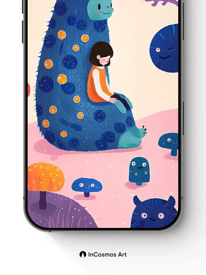 Did you know that in Japanese folklore, forest spirits often take the form of gentle, spotted creatures? Here, a child rests atop a deep-blue, star-dotted beast as if it were a living throne, surrounded by smiling mushrooms and floating orbs that glow like distant planets. The soft pink ground breathes warmth beneath their feet, while every dot on the creature pulses with quiet life—like constellations tucked into fur.
