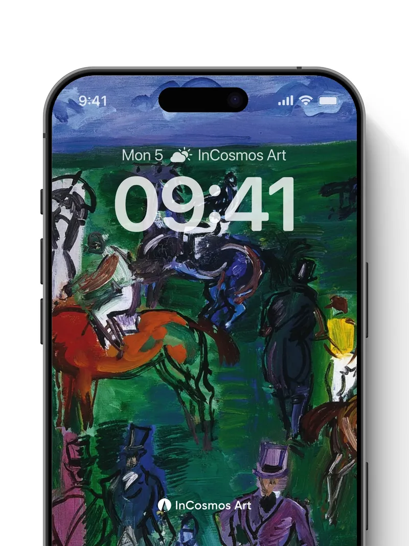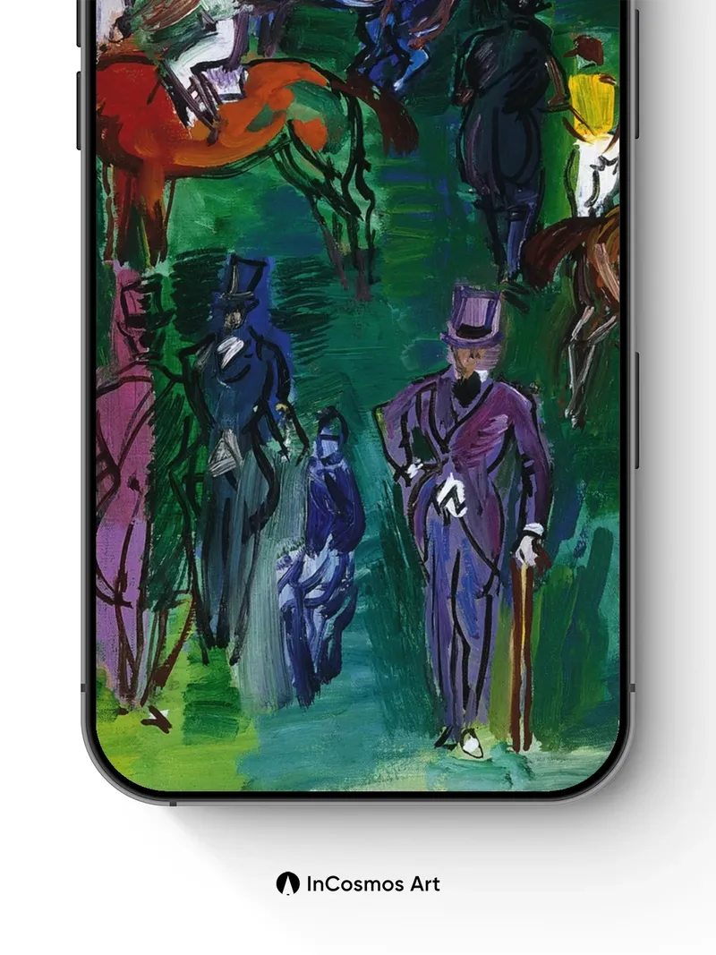 Did you know Matisse once said color could express emotion more powerfully than words? Here, vibrant horses and elegantly dressed figures gallop across a lush green field under a stormy sky, their forms outlined in bold strokes that dance like brushfire. The scene pulses with movement and theatrical energy, as if time itself paused to watch a grand, painted pageant unfold.