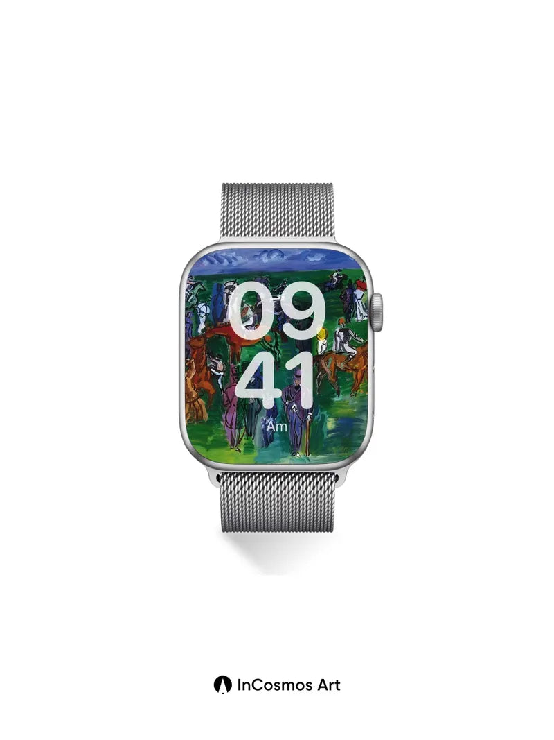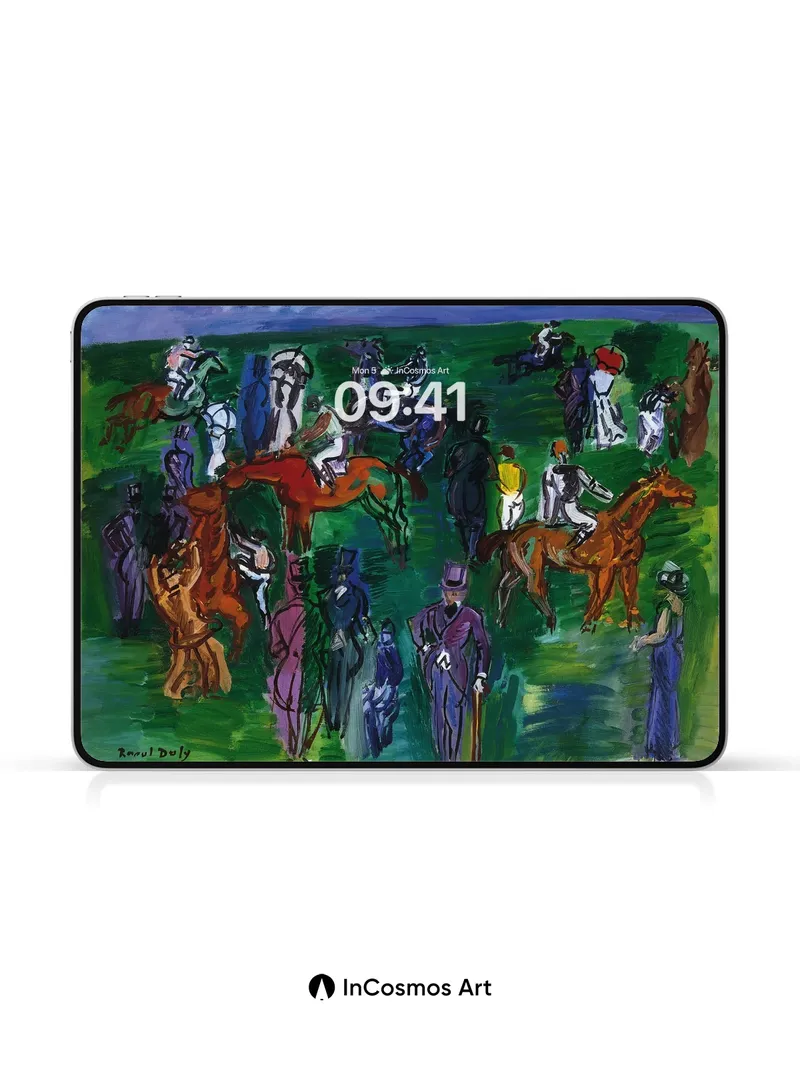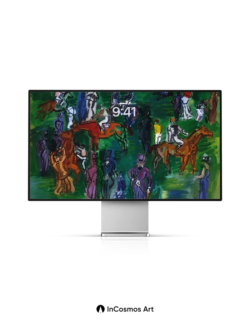 Debug page_description: Did you know Matisse once said color could express emotion more powerfully than words? Here, vibrant horses and elegantly dressed figures gallop across a lush green field under a stormy sky, their forms outlined in bold strokes that dance like brushfire. The scene pulses with movement and theatrical energy, as if time itself paused to watch a grand, painted pageant unfold. Share this with your best friend. Send this to your love and swap a matching set. What if every ride you took was painted by a dream?