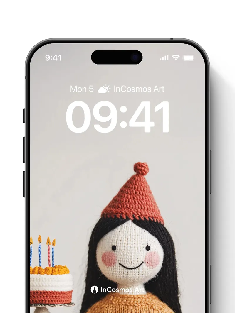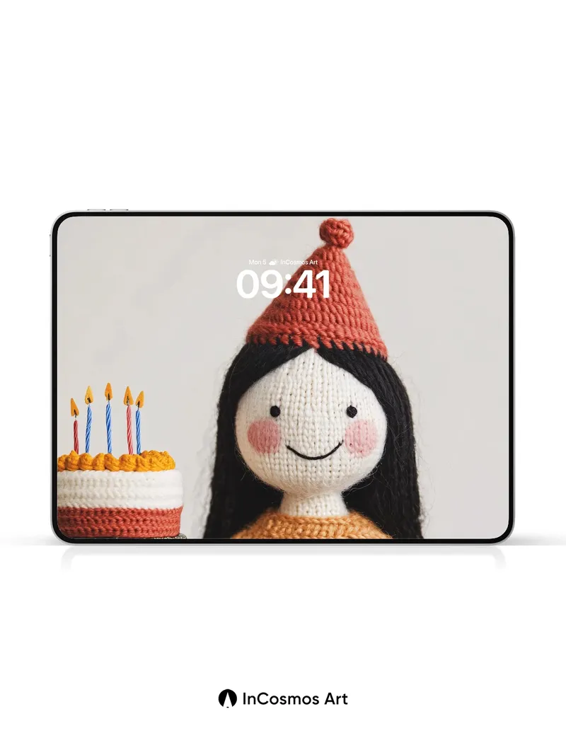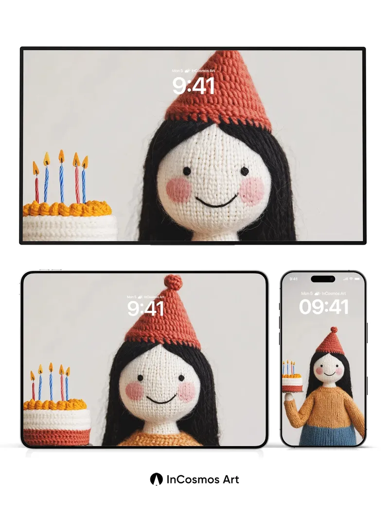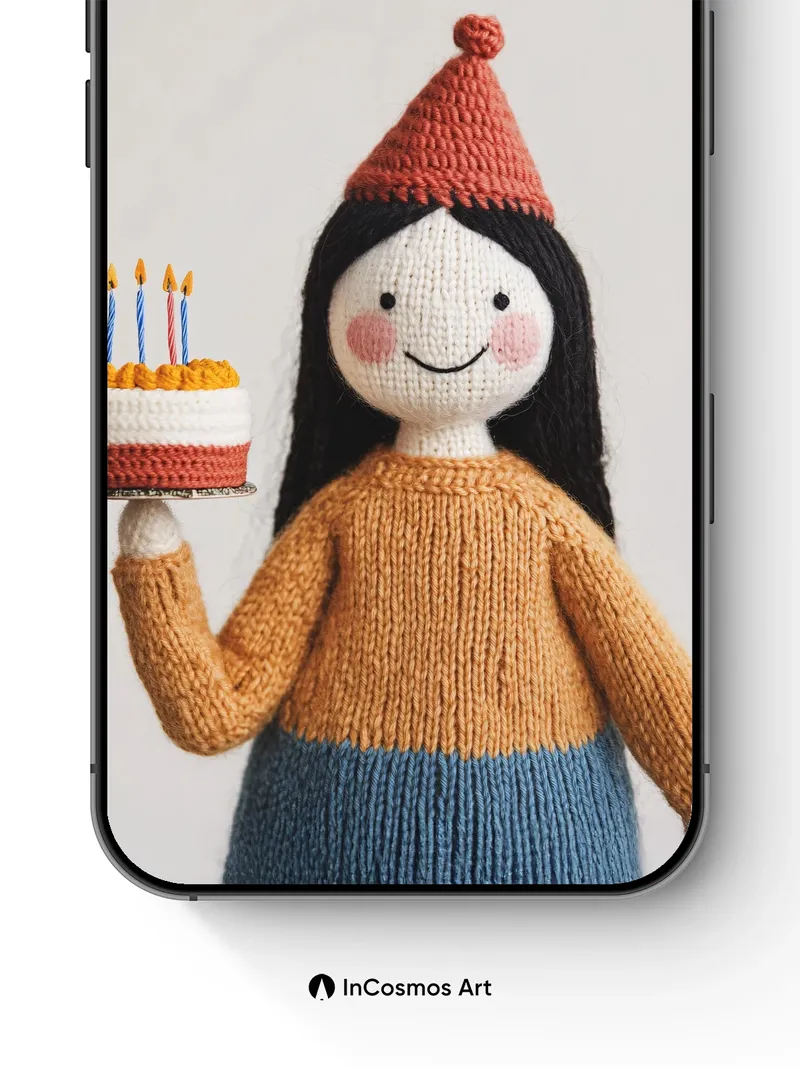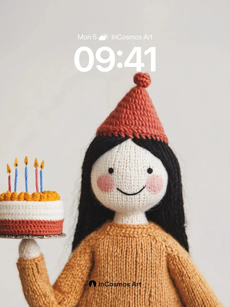 Whimsical Knit Doll Wallpaper with Birthday Cake