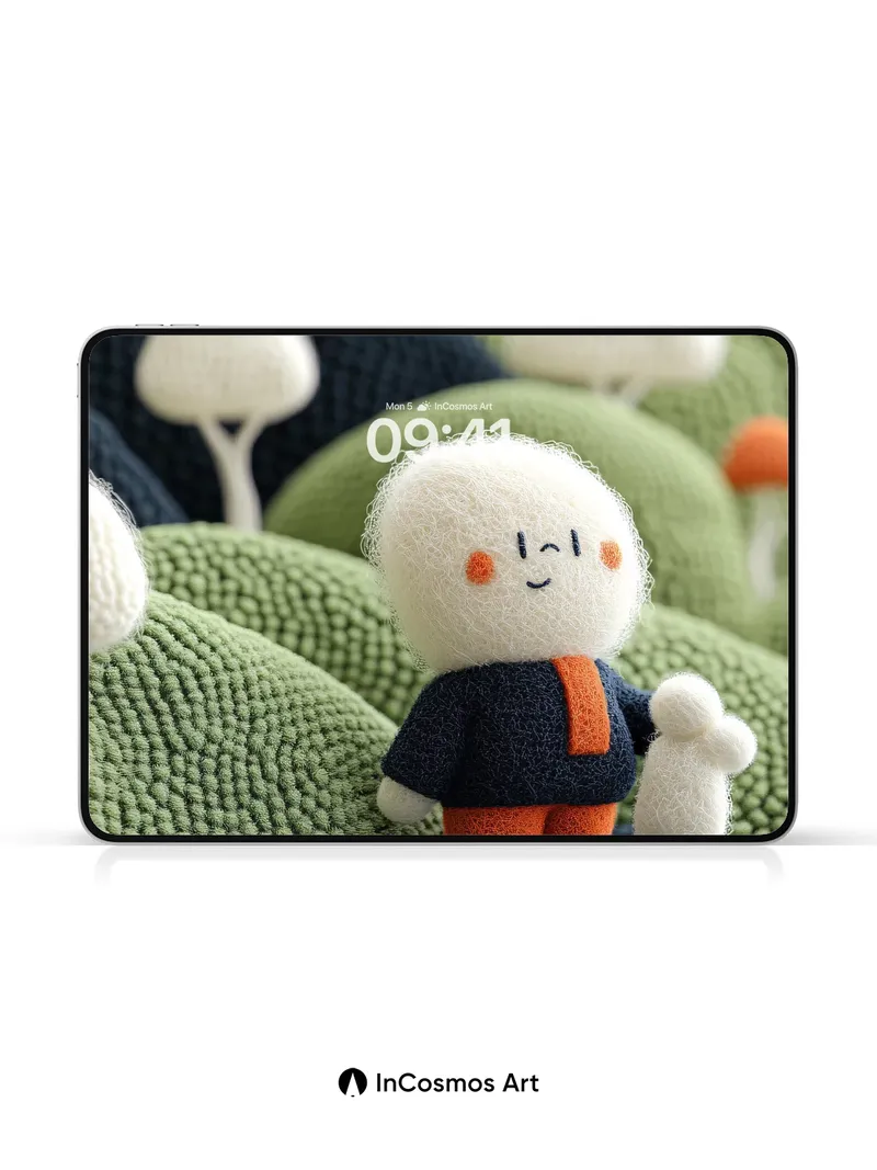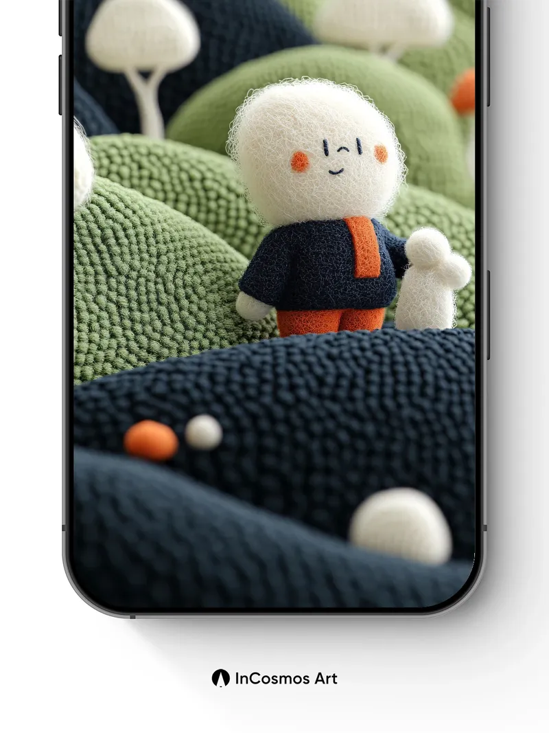 Whimsical Knit Landscape Wallpaper with Fuzzy Characters