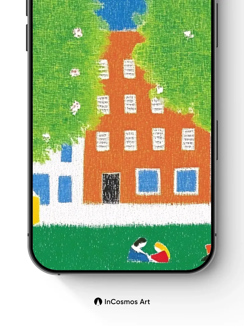 Did you know that in the 1960s, children’s book illustrators began using textured paper to mimic grass and sky? Here, each blade of green feels like a tiny thread stitched into daylight, while the trees breathe with soft white blossoms floating like whispers. The orange building hums with quiet warmth, its windows like eyes watching over two figures resting beneath the canopy—where color doesn’t just sit, it leans into stillness.