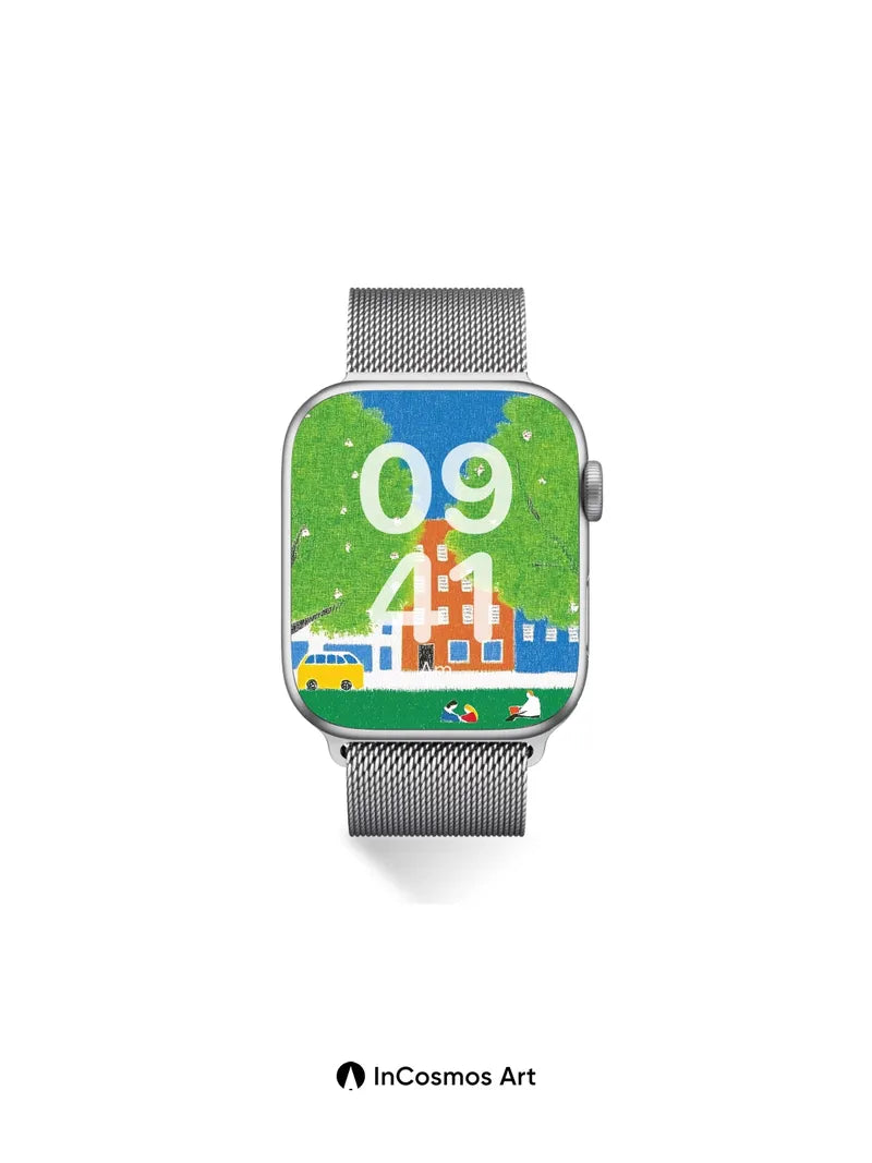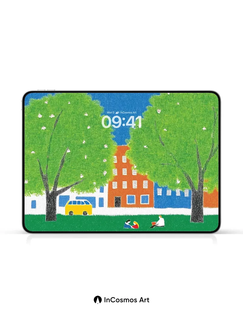 Debug product.metafields.custom.desc: Did you know that in the 1960s, children’s book illustrators began using textured paper to mimic grass and sky? Here, each blade of green feels like a tiny thread stitched into daylight, while the trees breathe with soft white blossoms floating like whispers. The orange building hums with quiet warmth, its windows like eyes watching over two figures resting beneath the canopy—where color doesn’t just sit, it leans into stillness.