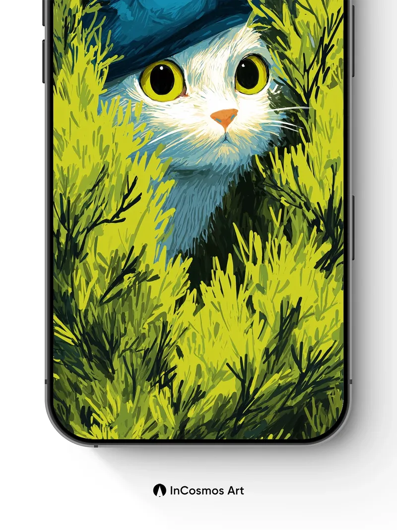 Debug page_description: Did you know cats can see in near-complete darkness, their pupils dilating like liquid obsidian? This hidden feline peers through a thicket of lime-green foliage, its eyes wide and luminous beneath a soft blue cap, as if caught mid-spy in a garden of secrets. The brushstrokes breathe life into every needle-like leaf, making the scene feel both still and alive. Share this with your best friend. Send this to your love and swap a matching set. What if the cat knew you were watching?