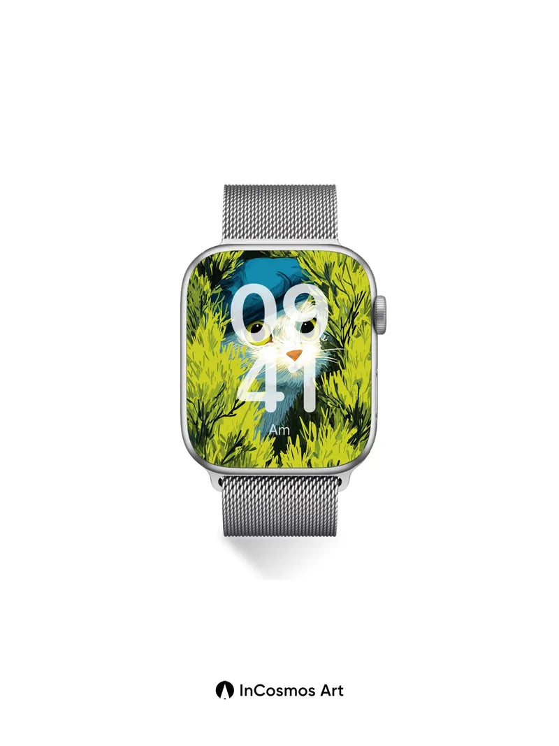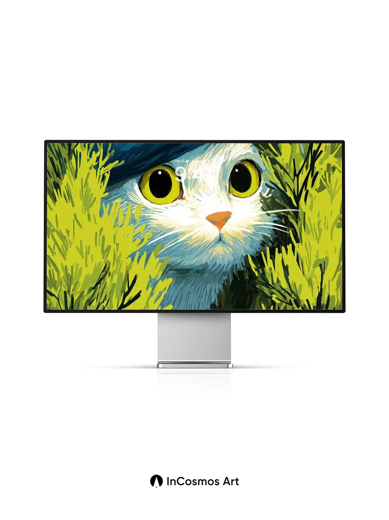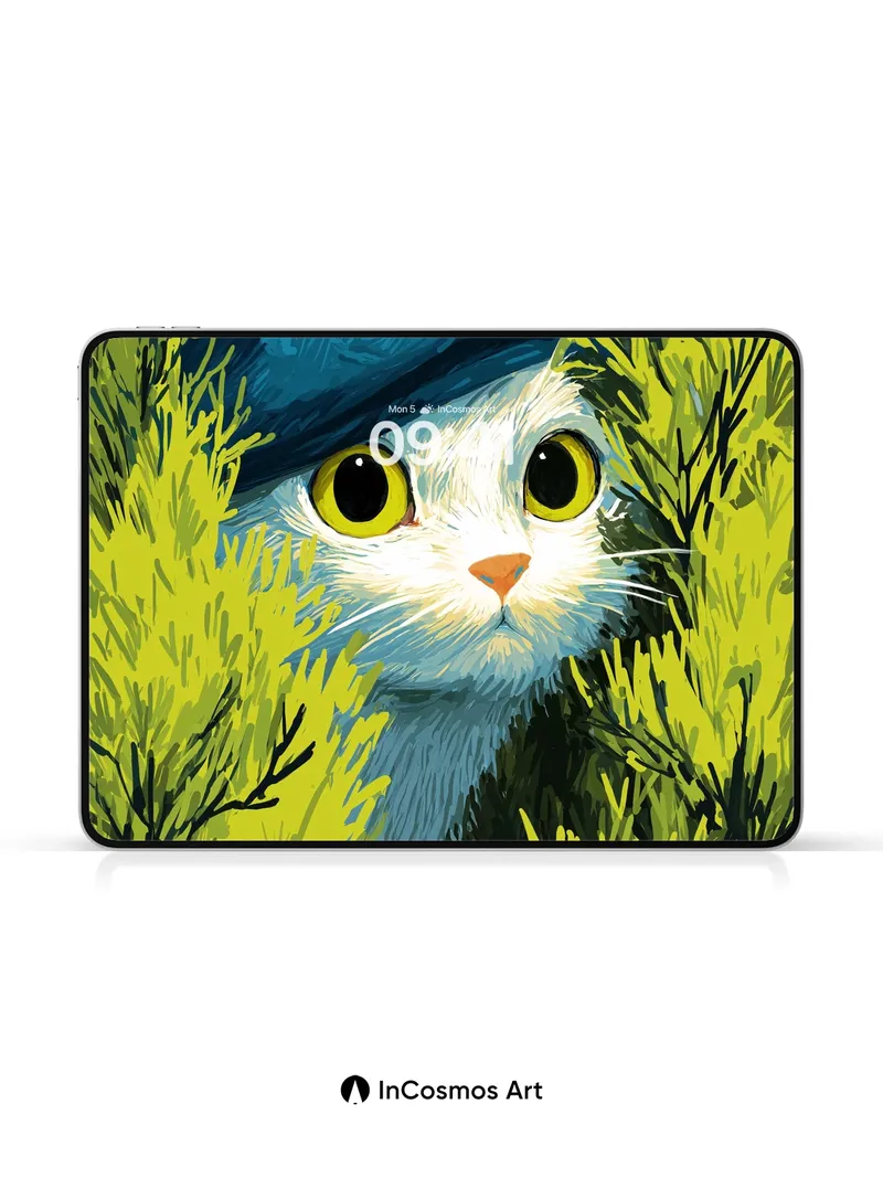 Debug product.metafields.custom.desc: Did you know cats can see in near-complete darkness, their pupils dilating like liquid obsidian? This hidden feline peers through a thicket of lime-green foliage, its eyes wide and luminous beneath a soft blue cap, as if caught mid-spy in a garden of secrets. The brushstrokes breathe life into every needle-like leaf, making the scene feel both still and alive.