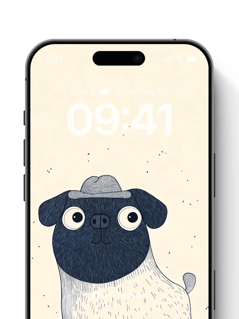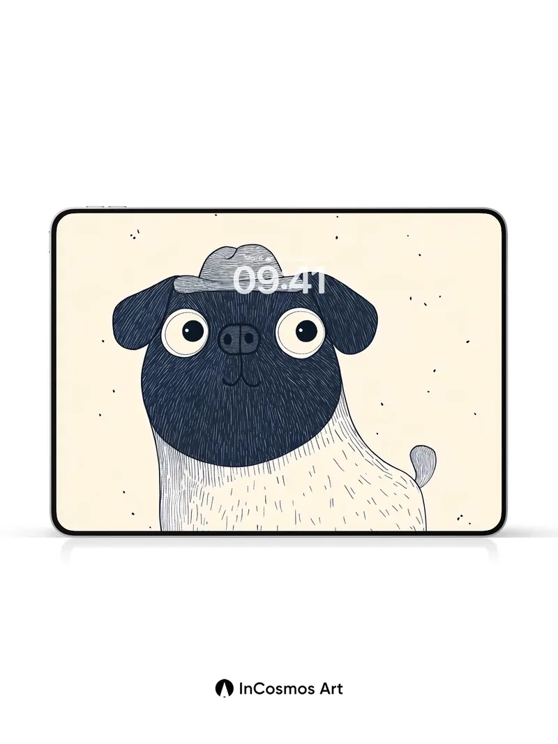 Debug page_description: Did you know pugs were once bred as royal companions in ancient China? This illustrated pup stands tall, its fur stitched with fine ink lines that shimmer like whispers of old stories. A soft gray hat perches atop its head, framing wide eyes that hold quiet curiosity. The beige background breathes gently, dotted with tiny specks like fallen stars, while the dog’s body glows with a subtle texture—each stroke alive, each curve tender. Share this with your best friend. Send this to your love and swap a matching set. What if every pet had a secret life in ink?