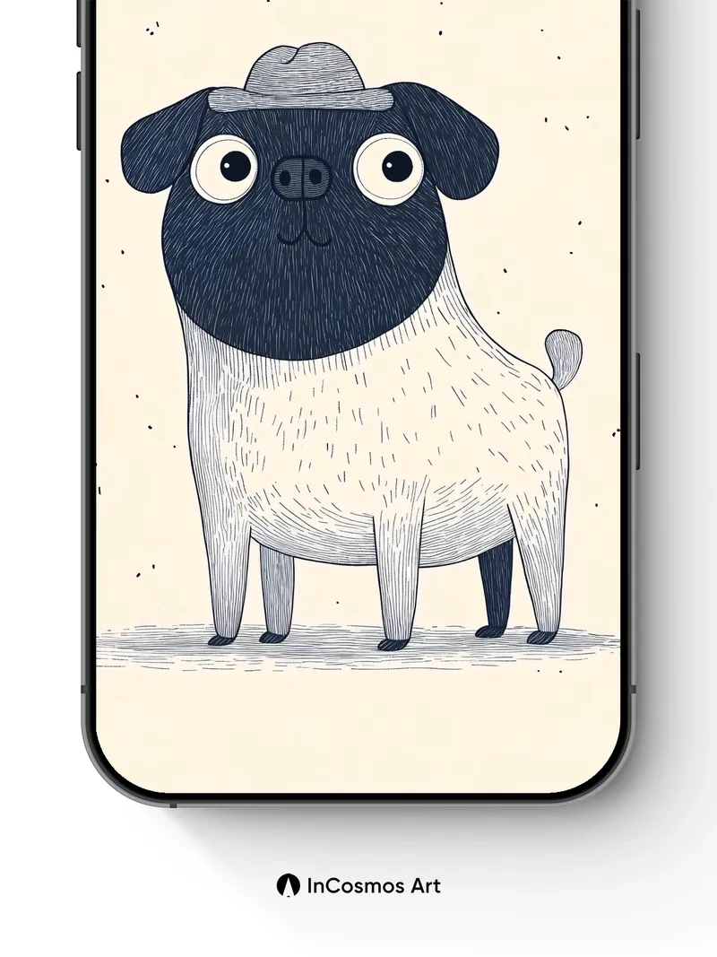 Did you know pugs were once bred as royal companions in ancient China? This illustrated pup stands tall, its fur stitched with fine ink lines that shimmer like whispers of old stories. A soft gray hat perches atop its head, framing wide eyes that hold quiet curiosity. The beige background breathes gently, dotted with tiny specks like fallen stars, while the dog’s body glows with a subtle texture—each stroke alive, each curve tender.
