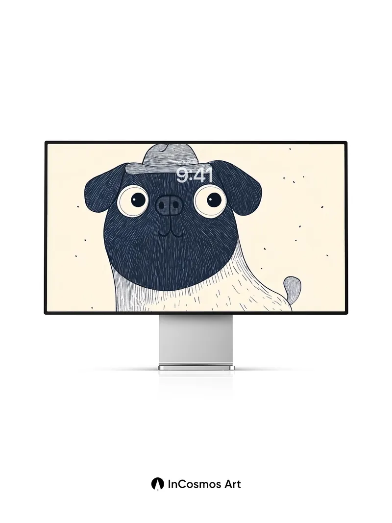Debug product.metafields.custom.desc: Did you know pugs were once bred as royal companions in ancient China? This illustrated pup stands tall, its fur stitched with fine ink lines that shimmer like whispers of old stories. A soft gray hat perches atop its head, framing wide eyes that hold quiet curiosity. The beige background breathes gently, dotted with tiny specks like fallen stars, while the dog’s body glows with a subtle texture—each stroke alive, each curve tender.