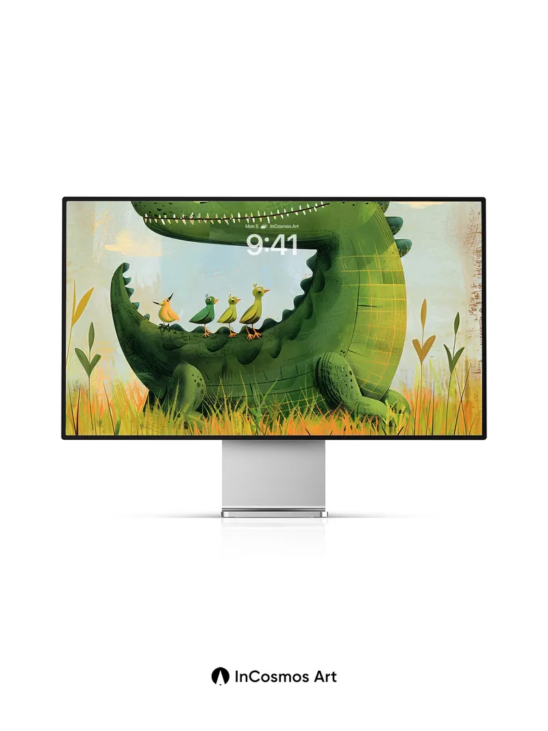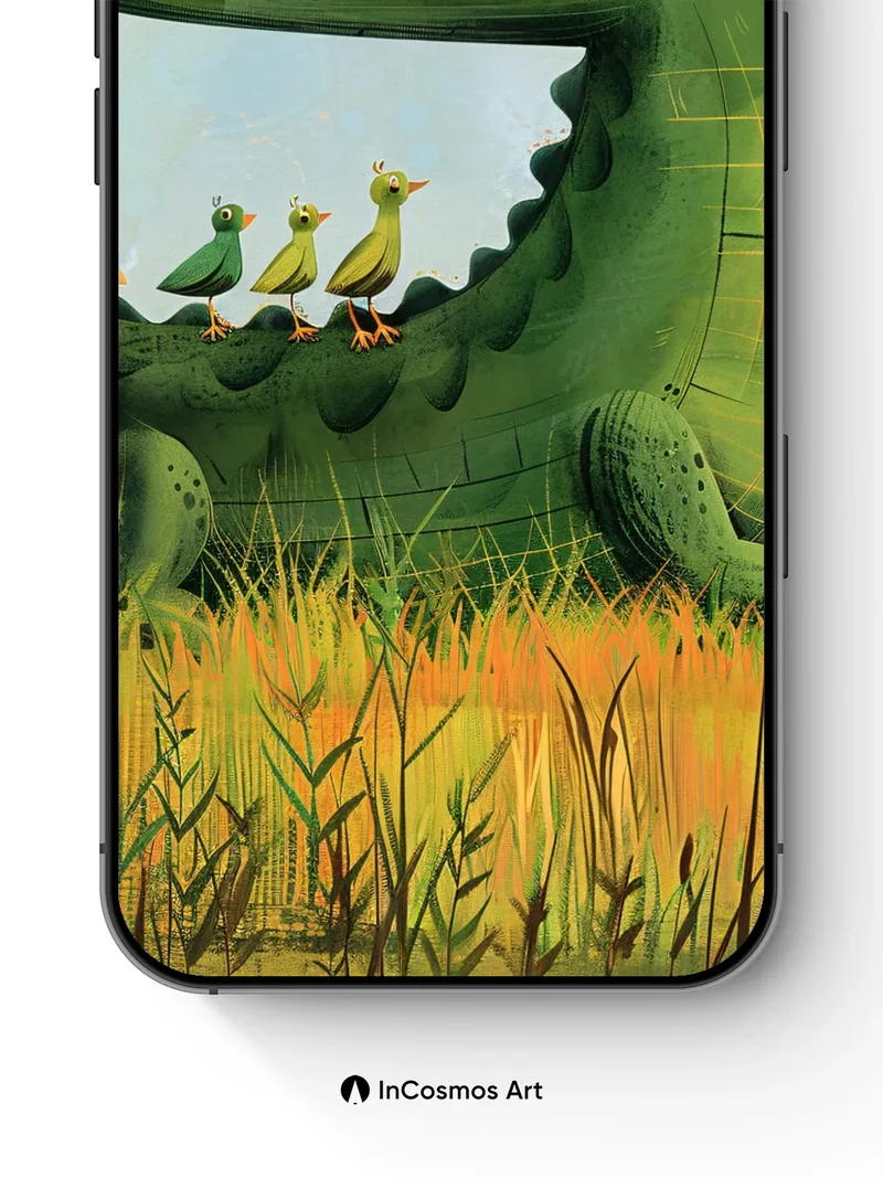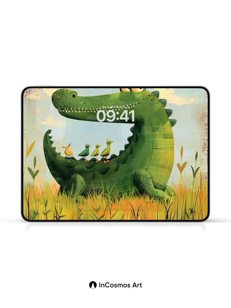 Debug product.metafields.custom.desc: Did you know crocodiles can remain motionless for hours, blending into reeds like living stone? Here, a gentle giant rests in golden marshlight, its scaly hide shimmering with mossy green veins, while four tiny birds perch in perfect balance along its back—each feather catching the sun like spun silk. The air hums with quiet joy, as if nature itself paused to whisper secrets between predator and prey.