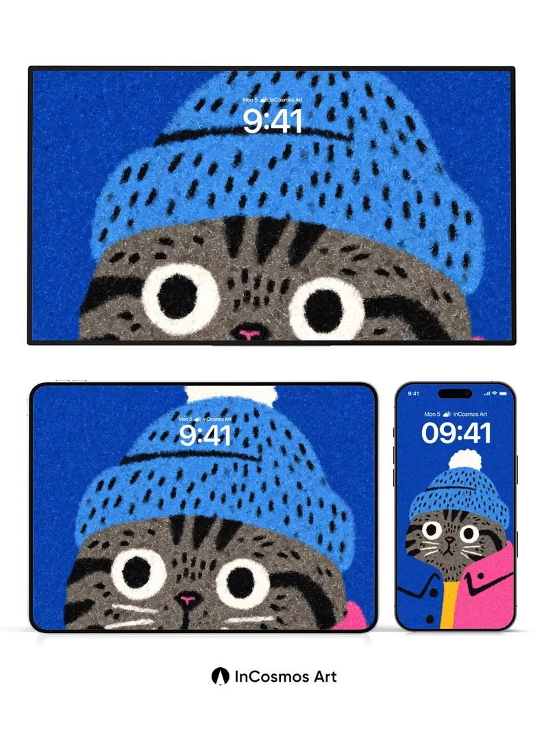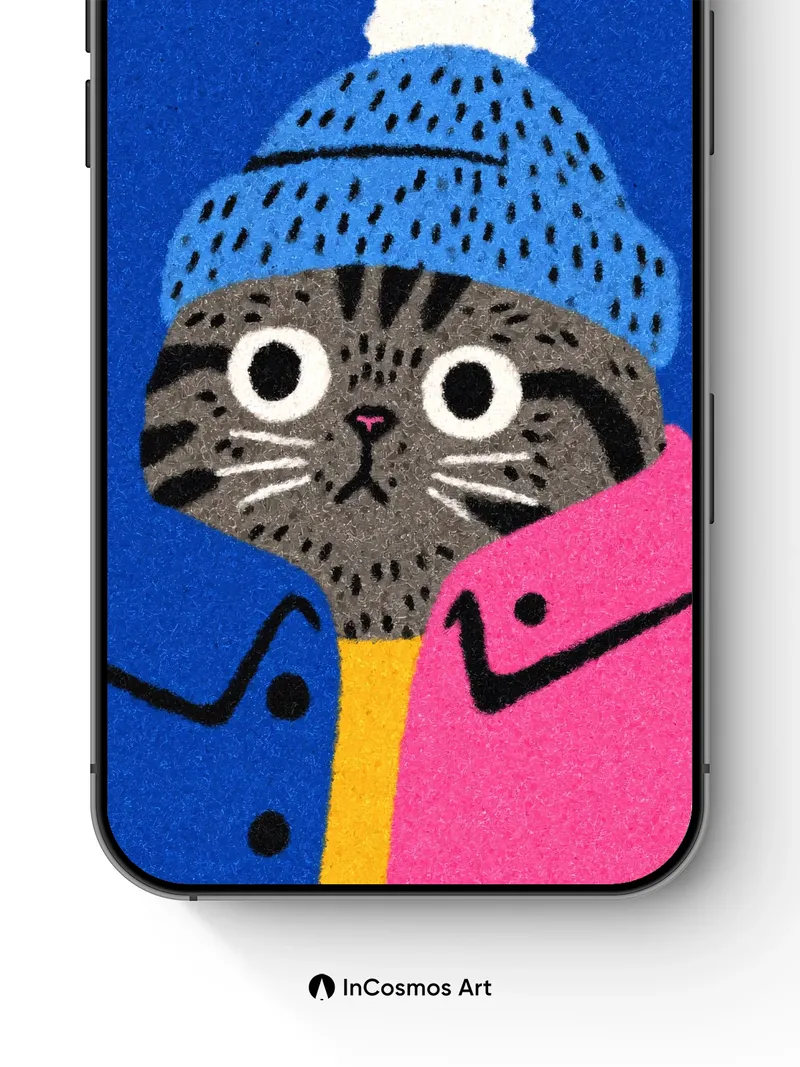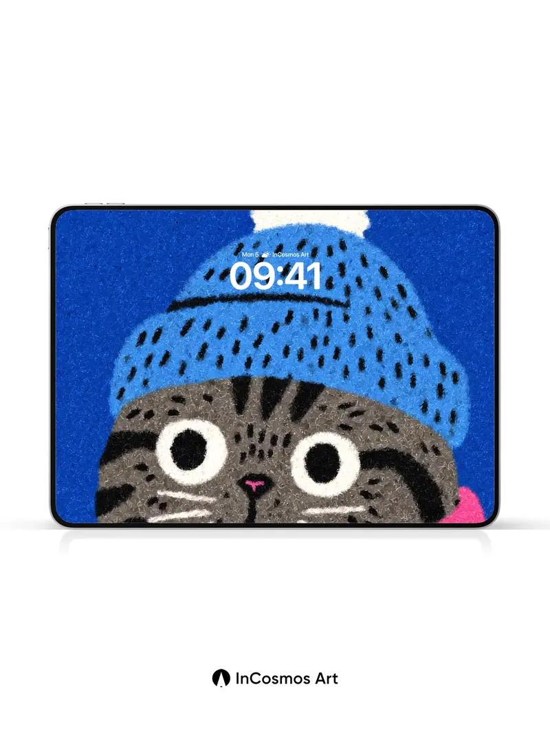 Whimsical Winter Cat Wallpaper with Knit Hat Charm