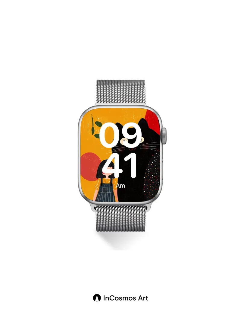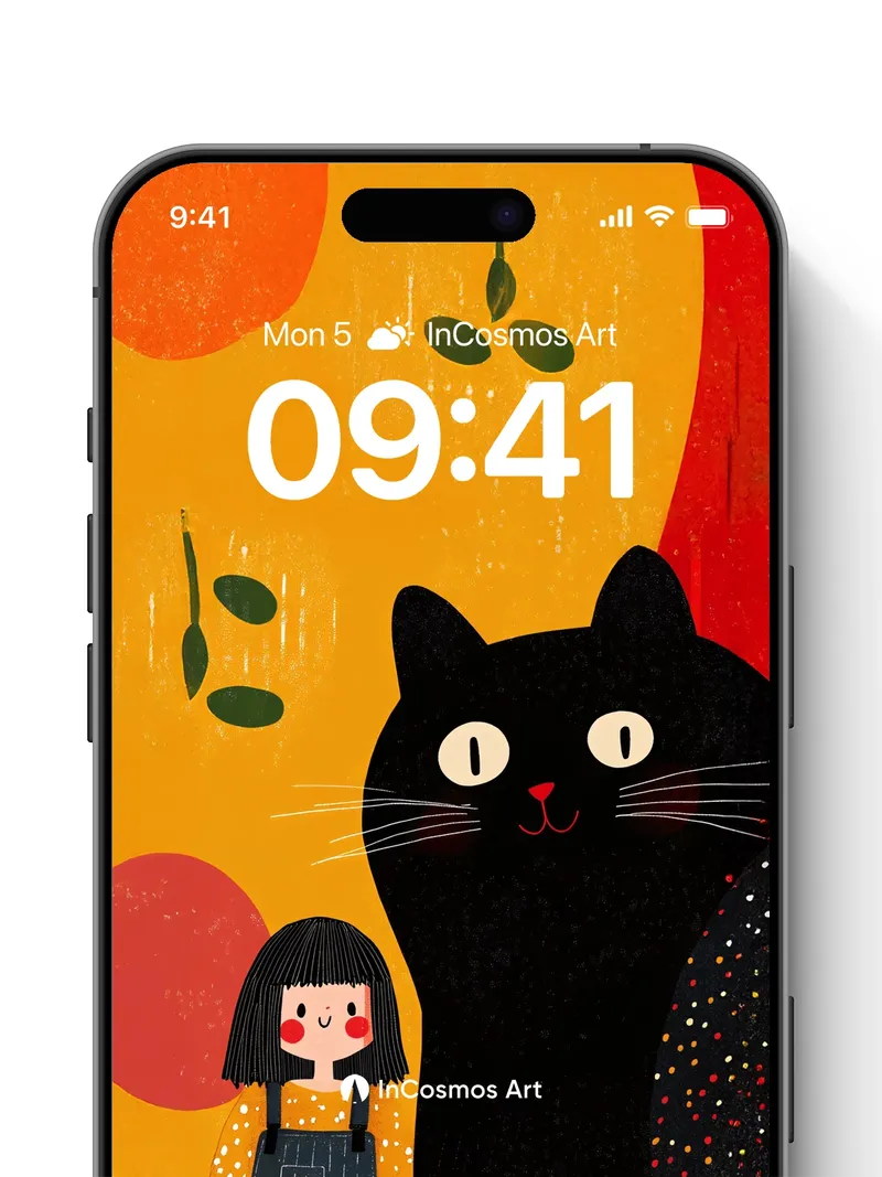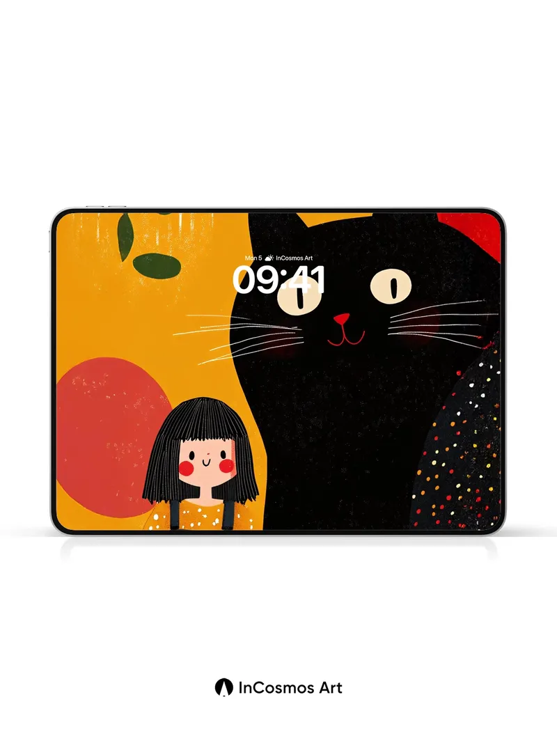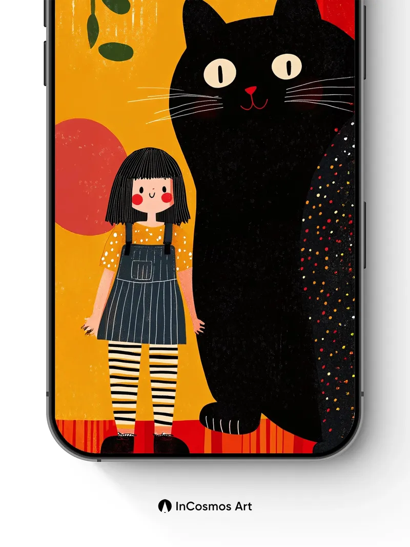 Debug product.metafields.custom.desc: Did you know that Japanese folklore says black cats bring good luck when they cross your path? In this vibrant scene, a bold orange backdrop breathes warmth like sunlight through stained glass, while a giant black cat with luminous eyes and dotted fur stands beside a girl in striped tights and pinafore, her cheeks rosy with quiet joy. The composition pulses with playful energy—each shape alive, each color speaking in whispers of retro charm and modern whimsy.