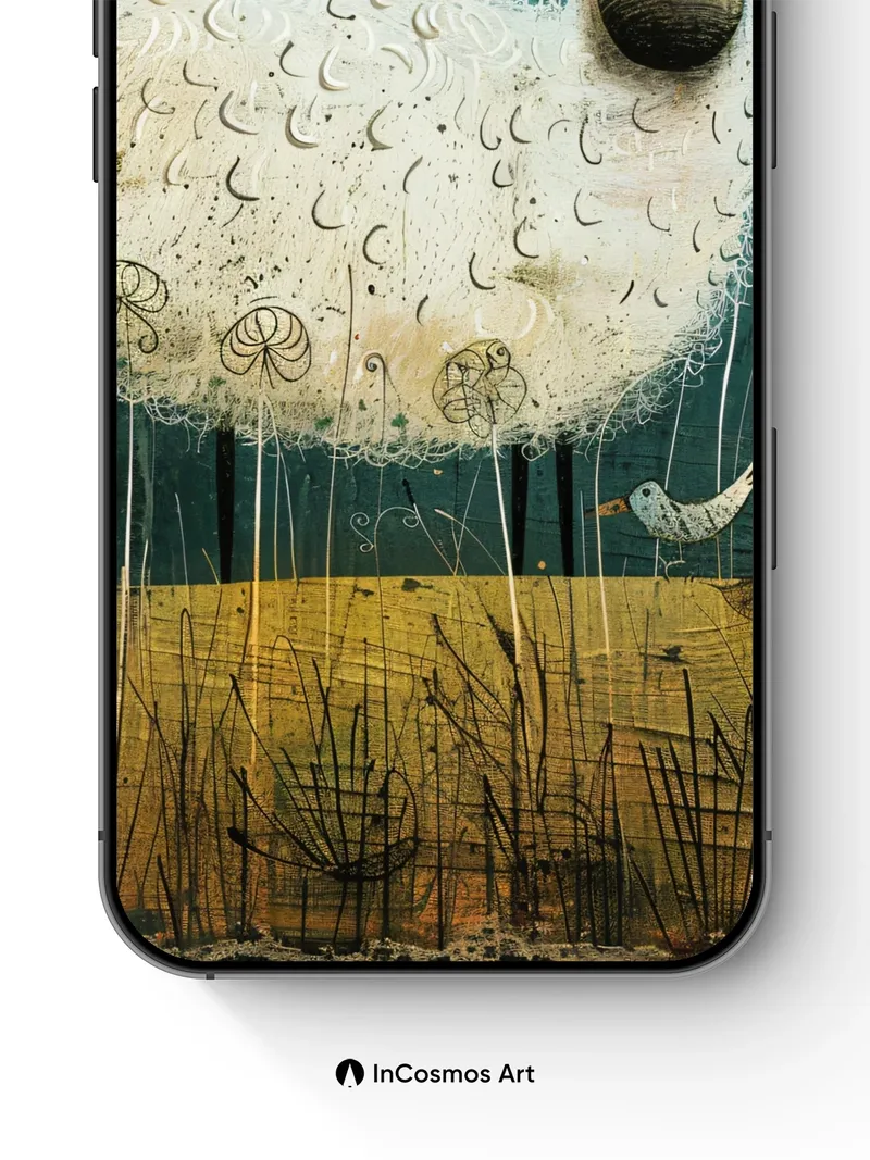 Did you know sheep wool can hold up to 30% of its weight in moisture without feeling damp? Here, a fluffy white sheep stands like a cloud over a golden field, its fleece etched with tiny crescent moons and spirals that seem to breathe with each passing breeze. Above, birds hover mid-flight—some perched on invisible wires, others drifting like thoughts across a teal sky textured like old parchment.