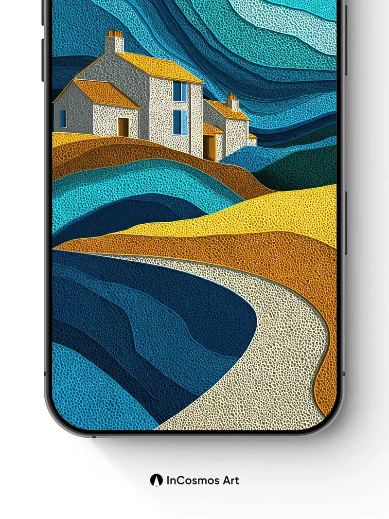 Debug page_description: Did you know that ancient stonemasons used whale oil to seal walls, giving them a soft, glowing depth? Here, the house breathes like a living fossil, its rough-hewn surface kissed by waves of swirling sky—each band a memory of wind and tide. The ground pulses beneath it, golden and cracked like sunbaked earth, while the heavens spiral in deep teal currents, as if the cosmos itself is whispering secrets into stone. Share this with your best friend. Send this to your love and swap a matching set. What if your home could remember the storm?