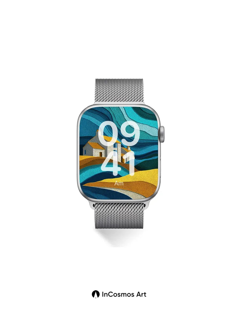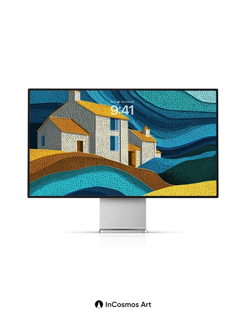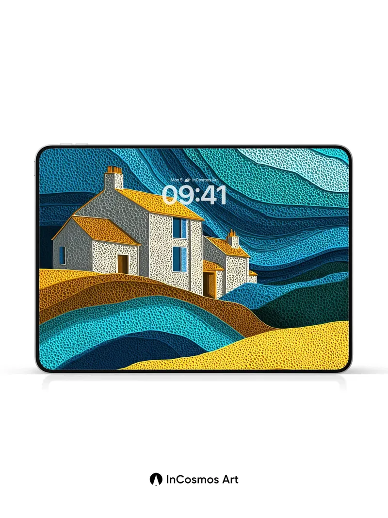 Debug product.metafields.custom.desc: Did you know that ancient stonemasons used whale oil to seal walls, giving them a soft, glowing depth? Here, the house breathes like a living fossil, its rough-hewn surface kissed by waves of swirling sky—each band a memory of wind and tide. The ground pulses beneath it, golden and cracked like sunbaked earth, while the heavens spiral in deep teal currents, as if the cosmos itself is whispering secrets into stone.