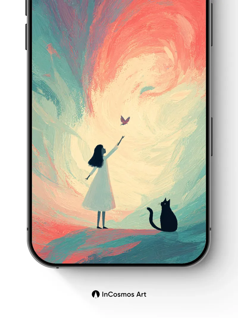 Did you know the color teal was once used in ancient Egyptian rituals to symbolize rebirth? Here, it swirls like a living storm around a girl reaching for a butterfly, her dress catching the breath of light. A black cat watches from the edge, eyes wide with quiet knowing, as the sky spirals into a vortex of coral and dusk—where every brushstroke feels like a memory made visible.