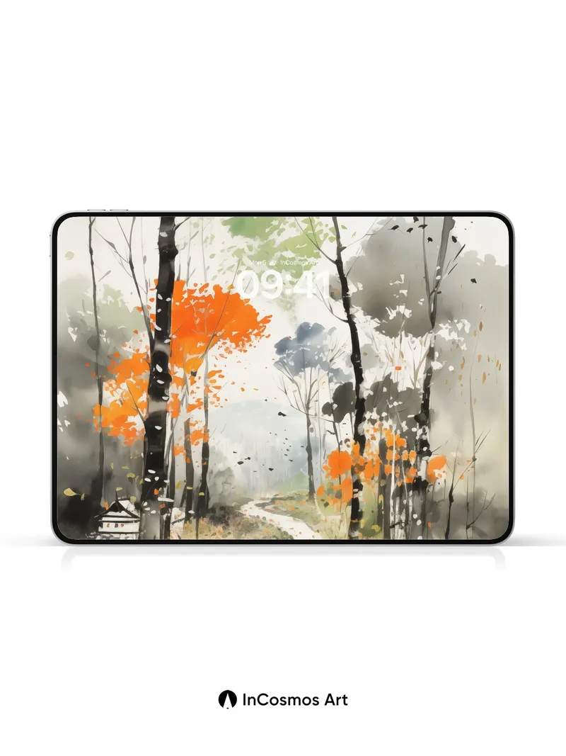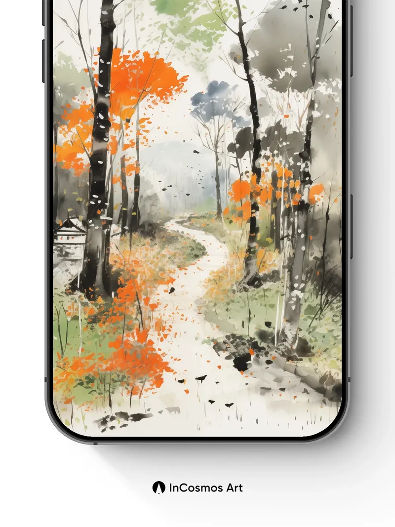 Whispering Autumn Path Wallpaper with Floating Leaves