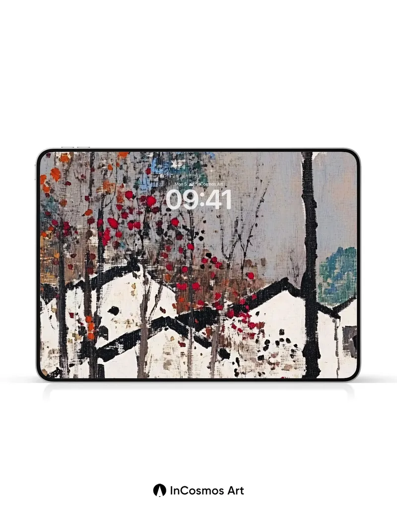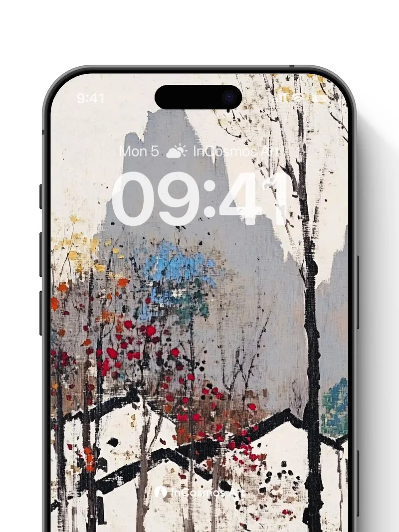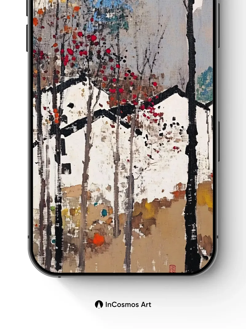 Debug page_description: Did you know that traditional Chinese ink wash paintings often use minimal pigment to suggest vast landscapes? Here, delicate brushstrokes of crimson and ochre leaves flutter against stark black trunks, while distant mountains fade into a soft haze like breath on glass. The texture feels almost tactile—each splatter a memory of wind, each line a quiet echo of solitude in the forest. Share this with your best friend. Send this to your love and swap a matching set. What if every tree held a secret written in falling leaves?