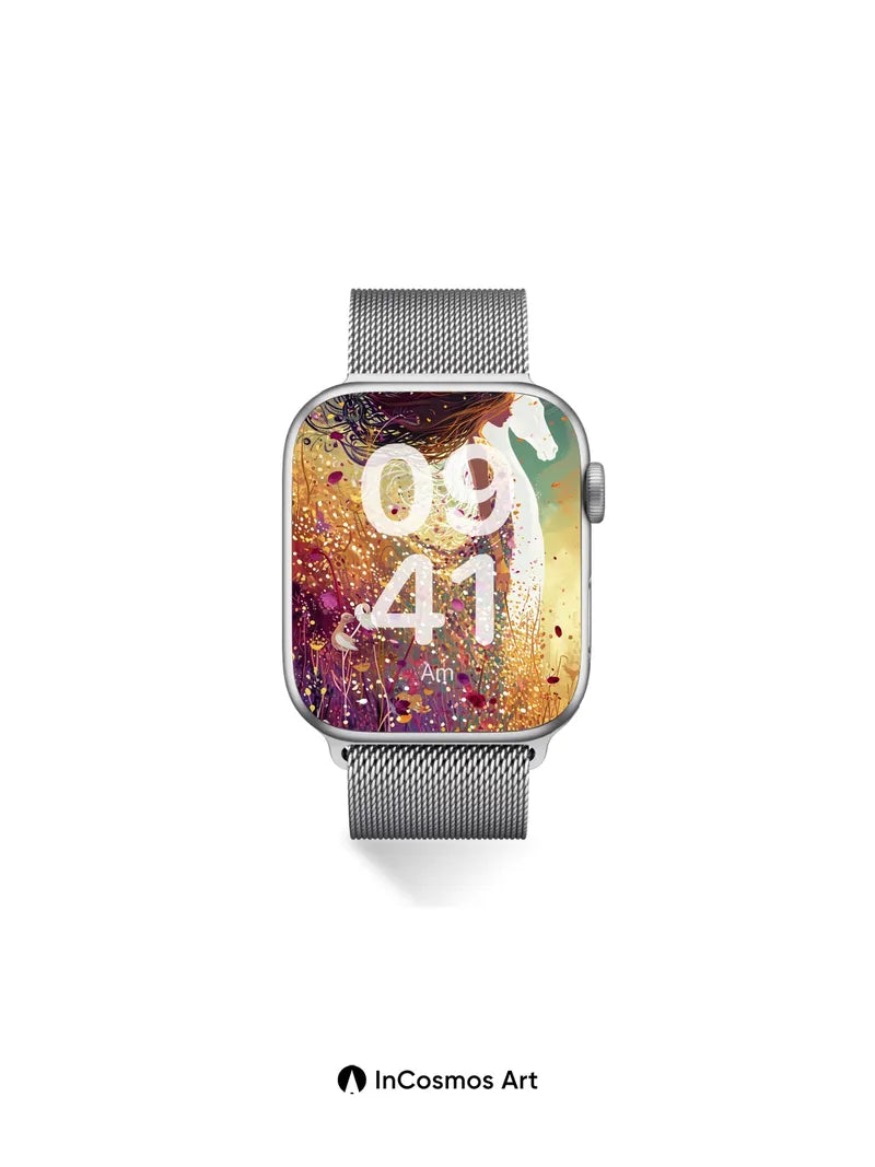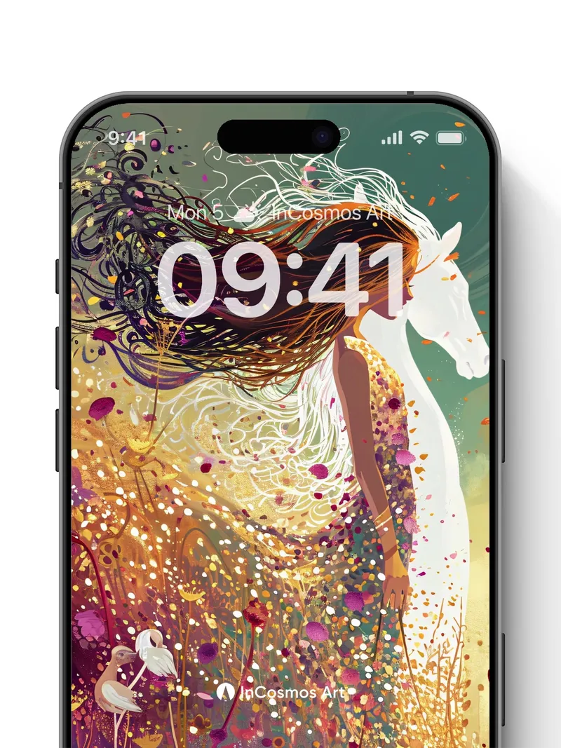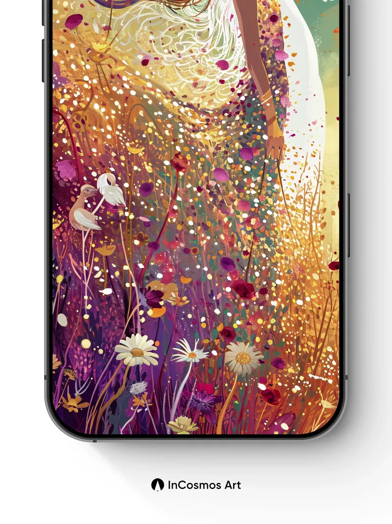 Debug product.metafields.custom.desc: Did you know that ancient Greeks believed horses carried souls to the afterlife? Here, a woman’s hair dances like living vines through a field of luminous flowers, her silhouette merging with a spectral white horse as golden dust swirls in the air. The scene breathes with motion—color blooms from the earth, petals spiral upward, and light crawls across textures like silk spun from stardust.