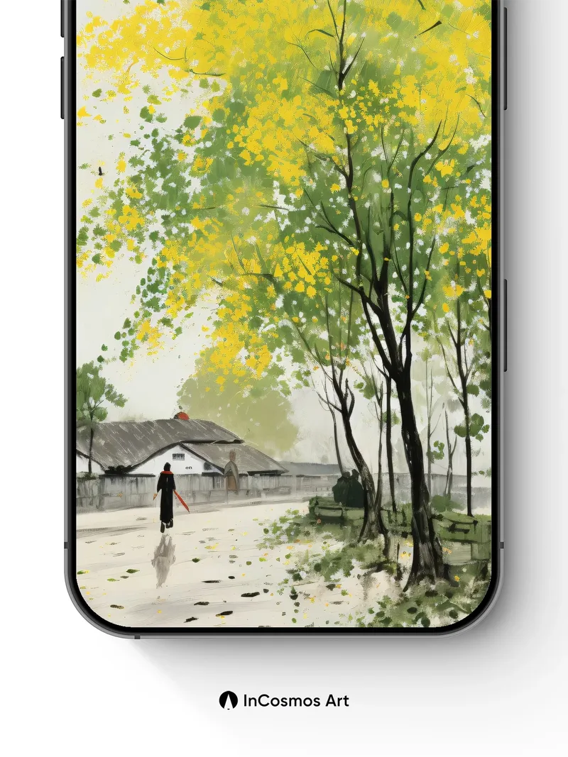 Did you know that in traditional Japanese art, falling leaves symbolize impermanence? Here, golden-green foliage drifts like thoughts through a quiet village path, where light breathes softly over weathered stone and mist-laced air. A lone figure walks beneath the tree’s crown, their silhouette fading into memory as birds scatter above—each leaf a tiny story released into the wind.