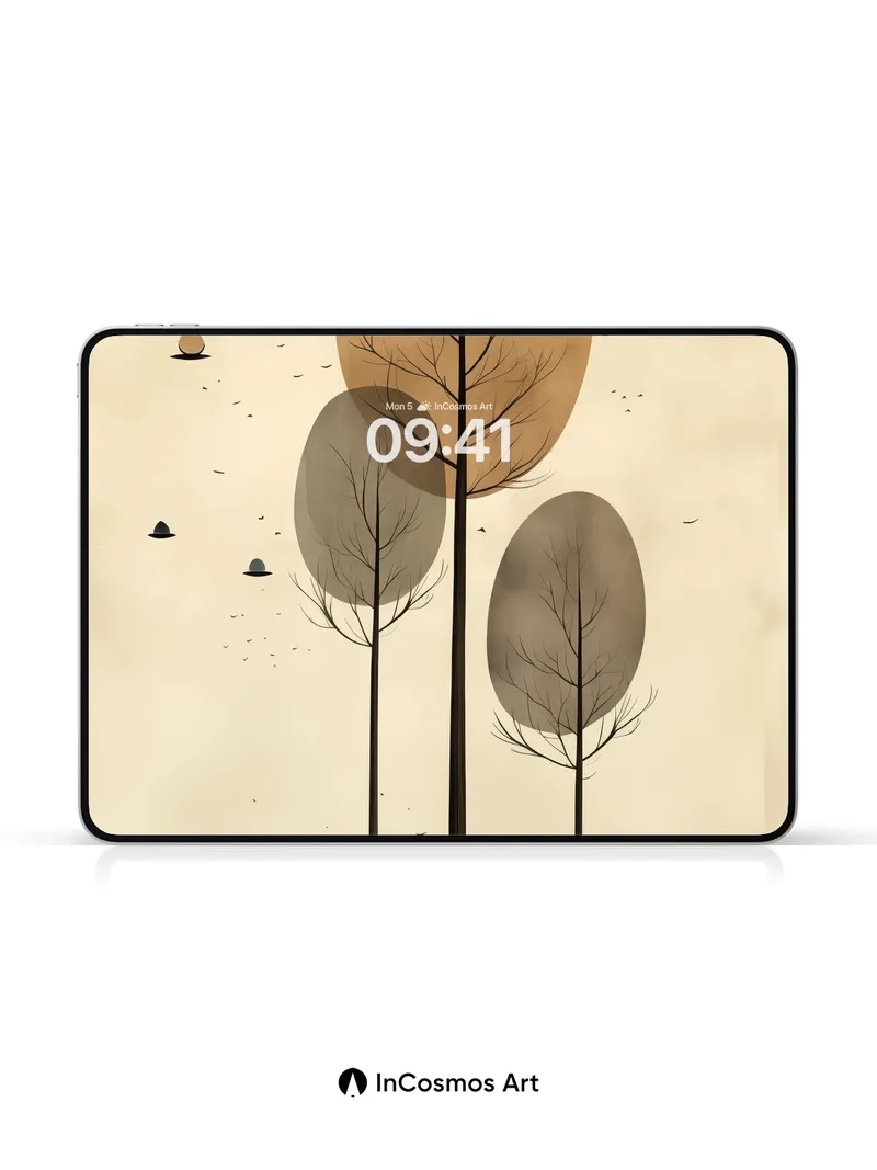 Debug page_description: Did you know the color ochre was once used in ancient cave paintings to evoke earth’s heartbeat? Here, bare trees rise like silhouettes from a hushed field, their oval crowns glowing with warm sepia light that seems to breathe through the paper. Birds drift across the sky like scattered thoughts, and three floating orbs hover—silent moons or distant lanterns—casting no shadow, only memory. The ground fades into a darkened horizon where grasses tremble as if listening. Share this with your best friend. Send this to your love and swap a matching set. What if the trees remember everything you’ve ever whispered?