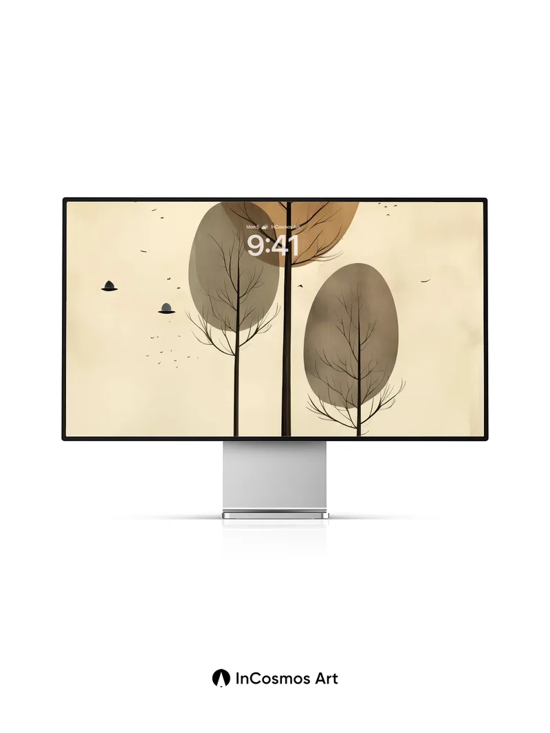 Debug product.metafields.custom.desc: Did you know the color ochre was once used in ancient cave paintings to evoke earth’s heartbeat? Here, bare trees rise like silhouettes from a hushed field, their oval crowns glowing with warm sepia light that seems to breathe through the paper. Birds drift across the sky like scattered thoughts, and three floating orbs hover—silent moons or distant lanterns—casting no shadow, only memory. The ground fades into a darkened horizon where grasses tremble as if listening.