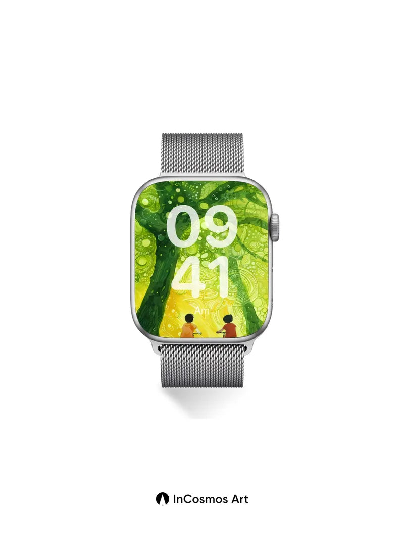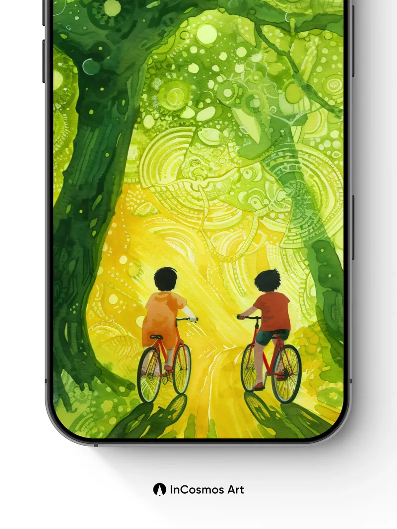 Debug product.metafields.custom.desc: Did you know that ancient forests once pulsed with bioluminescent fungi, casting soft glows beneath their branches? Here, light crawls over emerald veins in a tree that breathes like a living organism, its swirling patterns echoing the rhythm of nature’s hidden pulse. Two children ride bicycles into the golden heart of it all, silhouetted against a world where color and motion intertwine like whispered secrets.