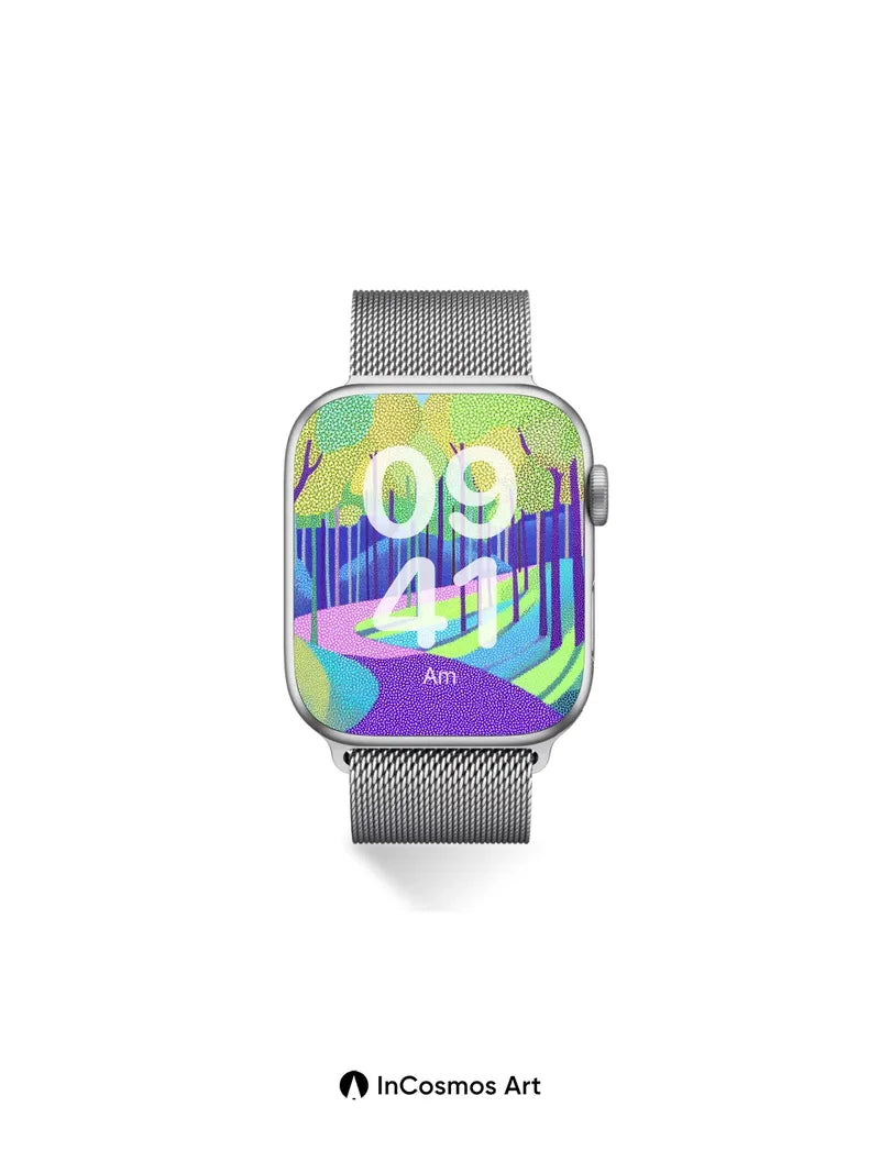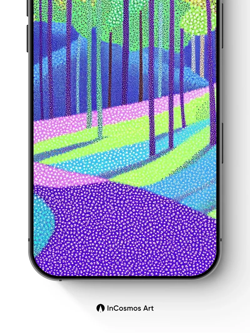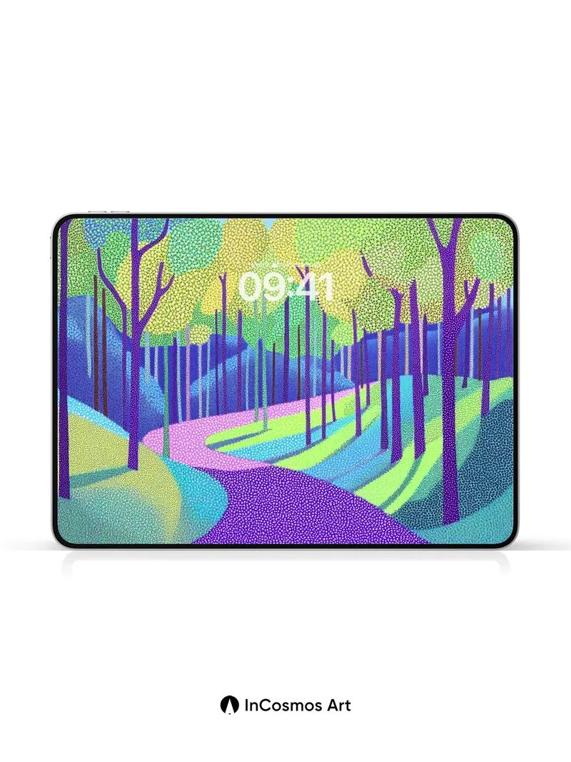 Debug page_description: Did you know that in some ancient forests, the trees hum at frequencies only felt through the soles of bare feet? Here, color breathes through a mosaic of violet trunks and lime-green hills, where each dot pulses like a tiny heartbeat beneath the surface. Light crawls over the winding path, stitching together shades of teal and magenta as if nature itself were weaving a dream. Share this with your best friend. Send this to your love and swap a matching set. What if every step you took left a trail of forgotten memories?