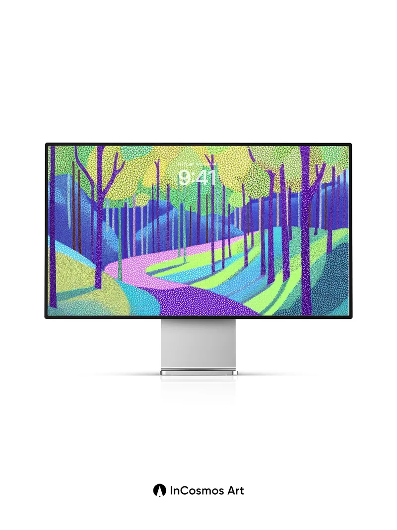 Debug product.metafields.custom.desc: Did you know that in some ancient forests, the trees hum at frequencies only felt through the soles of bare feet? Here, color breathes through a mosaic of violet trunks and lime-green hills, where each dot pulses like a tiny heartbeat beneath the surface. Light crawls over the winding path, stitching together shades of teal and magenta as if nature itself were weaving a dream.