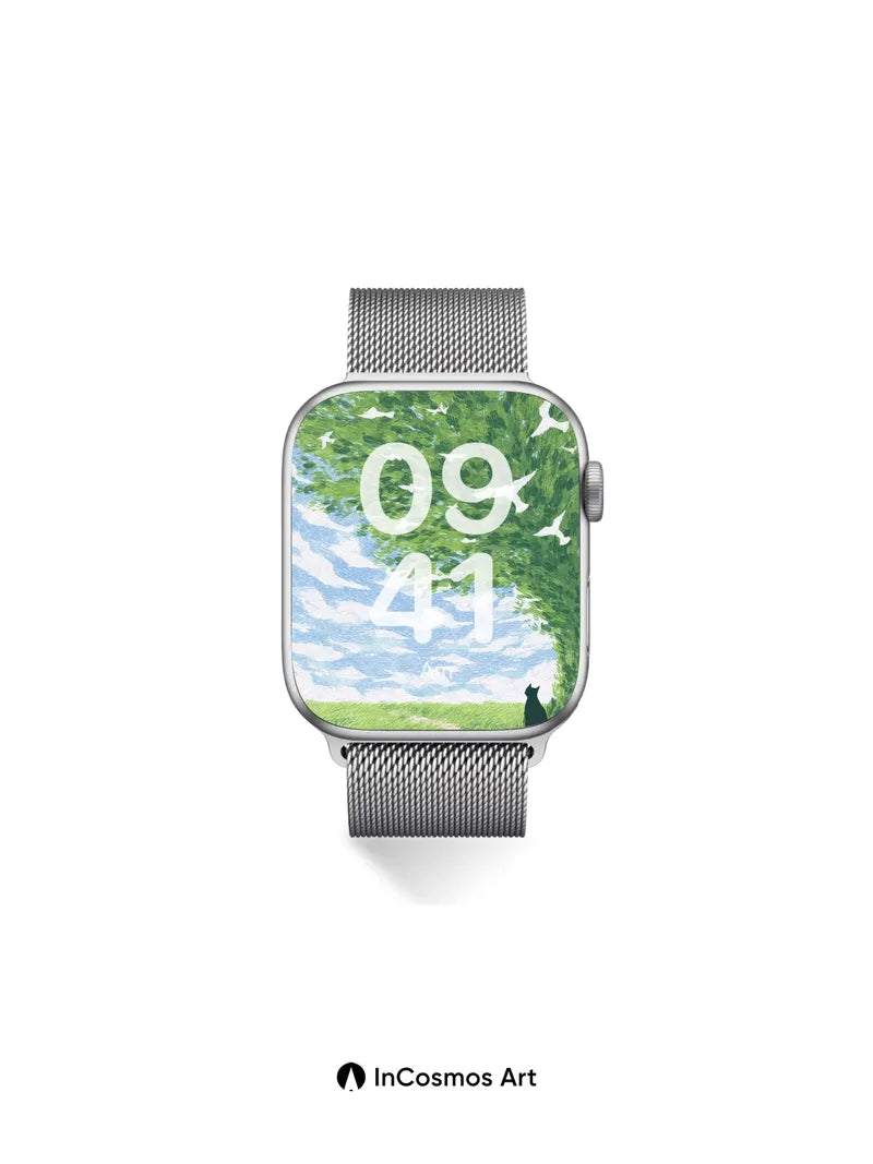 Debug product.metafields.custom.desc: Did you know that the leaves of a mature tree can intercept up to 90% of sunlight, creating a dappled world beneath? Here, light crawls through emerald fronds like liquid breath, while white birds carve silent arcs across a sky stitched with soft clouds. A solitary black cat sits at the edge of a winding path, its silhouette a quiet question against the green expanse—watching, waiting, dreaming.