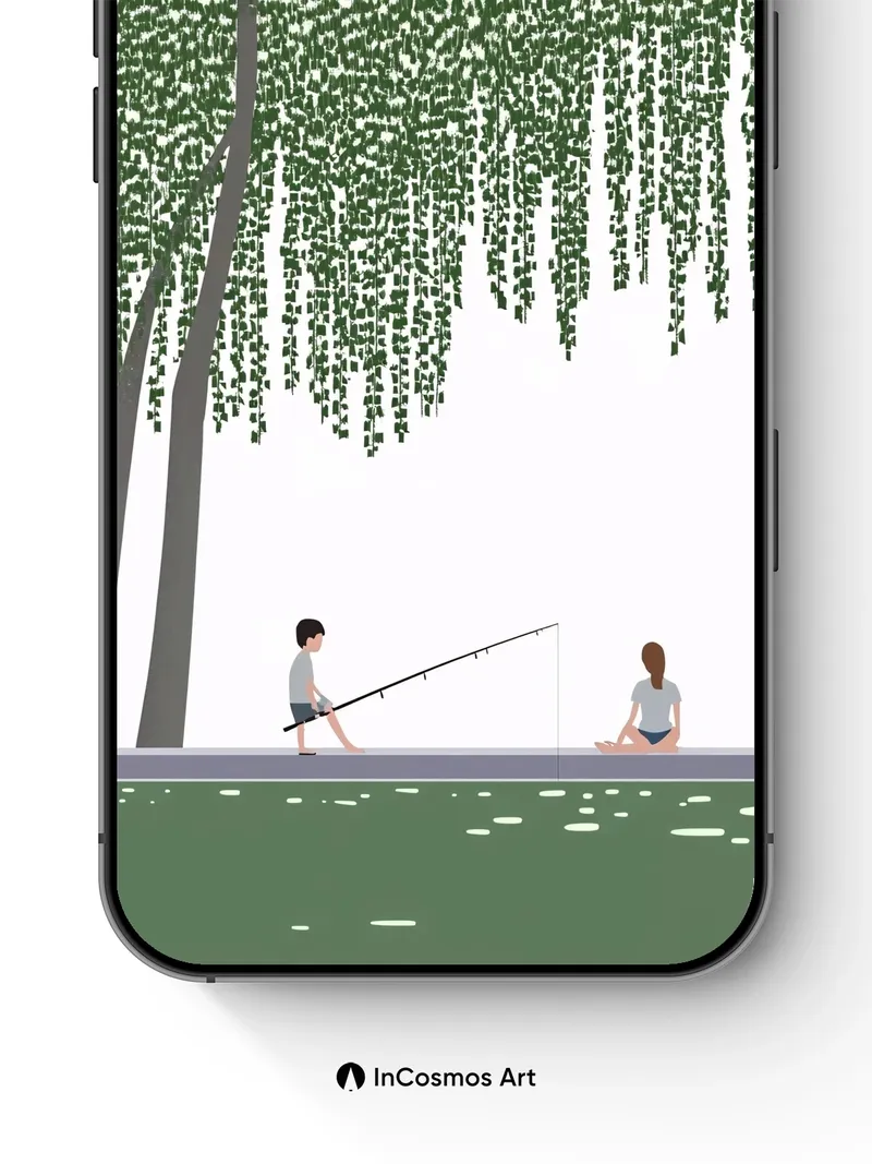 Did you know willow trees release a soft, calming scent when their leaves brush against the wind? Here, the drooping fronds hang like green silk threads, brushing the sky and framing two quiet figures by the water’s edge. Light filters through in dappled patterns, as if time itself has slowed to match the gentle sway of nature. The boy casts his line into stillness; the girl sits in silent reflection—each moment suspended beneath a living ceiling of foliage.