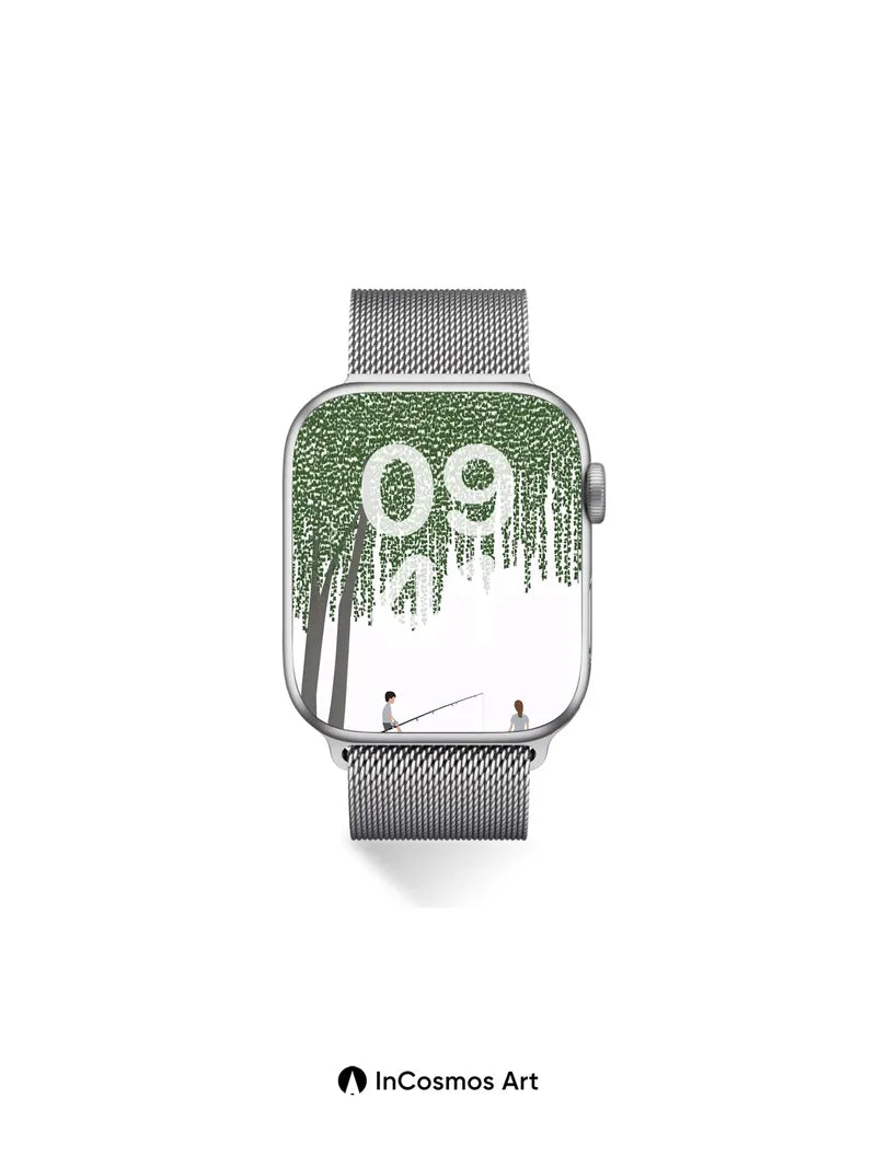 Debug product.metafields.custom.desc: Did you know willow trees release a soft, calming scent when their leaves brush against the wind? Here, the drooping fronds hang like green silk threads, brushing the sky and framing two quiet figures by the water’s edge. Light filters through in dappled patterns, as if time itself has slowed to match the gentle sway of nature. The boy casts his line into stillness; the girl sits in silent reflection—each moment suspended beneath a living ceiling of foliage.